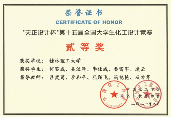 导航痕迹 当前位置: 首页 >> 教育教学 >> 化学工程专业认证 >> 正文 我院学子在2021年第十五届全国大学生化工设计竞赛中再创辉煌 由中国化工学会、中国化工教育协会、教育部高等学校化工类专业教学指导委员会主办的第十五届全国大学生化工设计竞赛华南赛区决赛由湖南湘潭大学于2021.8.3-5进行了线上承办。本次设计任务“为某大型化工企业设计一座异丙醇生产分厂或为现有的异丙醇生产分厂设计技术改造方案。相对现有生产装置的技术水平,要求技术提升达到《中国制造 2025》中提出的绿色发展 2025 年指标。” 设计任务包括工艺设计、管道设计、自控设计、设备设计选型、厂区布置、经济概算、可行性分析等。全方位考查和提升了化工学科领域学生的创新意识、对化工知识的综合运用能力,同时也进一步增强了学生的环保意识、人文关怀意识和社会责任感。 我院组织化学工程与工艺专业2018级26支队伍参赛,由李和平、吕奕菊、王晓娟、黎燕、王桂霞、姚金环、杨文、冯艳艳、刘峥、及方华等老师组成的团队进行指导。2018级卓越班本科生何鉴成、吴汶泽、李佳威、秦富军、凌云组成的代表队设计的作品“南京扬子石化有限公司年产8万吨异丙醇” 经过师生共同努力,以其出色的设计作品和精彩的线上现场答辩脱颖而出,勇夺赛区一等奖,荣获全国总决赛二等奖。同时,我校还获得全国二等奖1项、三等奖5项、华南赛区三等奖7项,在获奖比例与数量上均为历届参赛最好成绩。获奖情况如下: 表1 第十五届全国大学生化工设计竞赛获奖作品与成绩(77779193永利(中国)集团) 序号 团队名称 设计项目名称 参赛学生 指导教师 获奖等级(全国总决赛) 获奖等级(华南赛区) 1 牛气冲天 南京扬子石化有限公司年产8万吨异丙醇 何鉴成、吴汶泽、李佳威、秦富军、凌云 吕奕菊、李和平、孔翔飞、冯艳艳、及方华 二等奖 特等奖 2 仙乔化工魂 南京扬子石化年产5万吨异丙醇 余浩文、刘欢、尹贇、岳誉华、臧家望 李和平、吕奕菊、何方、唐群、邹志明 三等奖 二等奖 3 烯望工程 中石化镇海炼化化工有限公司年产11万吨异丙醇项目 邱祖文、刘美辰、沈子怡、傅观娇、陈梦香 吕奕菊、 李和平、 杨文、王晓娟、黄红霞 三等奖 二等奖 4 天赋异丙 中石化海南炼化年产20万吨异丙醇项目 邢淋慧、程夏、陈丽萍、胡志辉 吕奕菊、李和平、何方、冯艳艳、滕青湖 三等奖 二等奖 5 五个Pd元素 中国石化仪征化纤股份有限公司年产5万吨异丙醇项目设计 潘朝宇、黎淼、严传汉、黄承敏、林伯照 李世清、 张秀清、 黎燕、谭海军、王晓娟 三等奖 二等奖 6 共用电子 江西九江中石化年产5.2万吨异丙醇 郭雨婷、朱笑萱、刘雪玲、罗雨、李荣珍 李和平、吕奕菊、 及方华、王桂霞、何方 三等奖 ———— 7 千百度 齐鲁石化年产5万吨异丙醇改建 马凯、夏睿、吴富城、王燕、黄远菲 何方、吕奕菊、 李和平、及方华、邹志明 ———— 三等奖 8 向日葵 扬子石化新建年产5万吨异丙醇 寇杨光、张京慧、徐婷、李蕊、唐嘉鑫 何方、王晓娟、 吕奕菊、李和平、蒋光彬 ———— 三等奖 9 五飞小组 广州华隆石化有限公司年产10万吨异丙醇项目 牛元进、曾经宇、牟治颖、翟以祥、雷斌 黎燕、 郭燕军、 谭海军、黄红霞、张秀清 ———— 三等奖 10 剑指苍穹 山东海科有限公司分公司年产24万吨异丙醇项目 黎柏松、庞荣水、曾令航、鲍寒星、吴丽桃 黎燕、谭海军、张秀清、李雪明、李世清 ———— 三等奖 11 欣欣向荣小葵花 江苏飞翔集团凯凌化工(张家港)有限公司年产9.2万吨异丙醇项目 覃淑萍、邓志琳、杨燕平、张文娟、黄华斌 王晓娟、蒋光彬、冯艳艳、杨文、王永涛 ———— 三等奖 图1:国赛二等奖证书 【 发布日期:2021-12-29 浏览次数: 】 上一条:化学化工教研室组织化工2018同学进行参观实习暨毕业设计(论文)进行动员 下一条:化学工程与工艺专业认证中期材料总结会