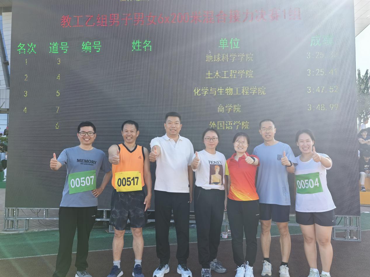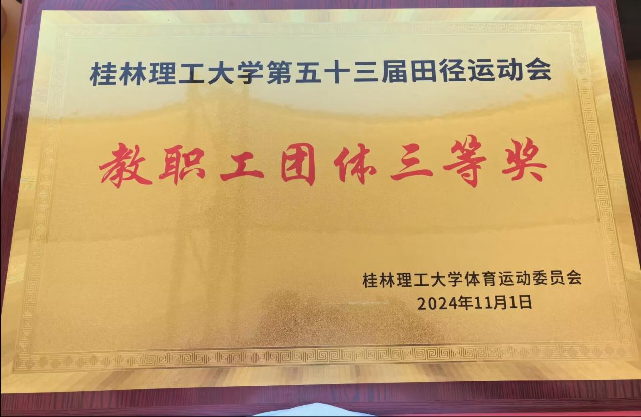 秋风送爽,阳光明媚,金桂飘香。10月31日,学校第53届田径运动会在雁山校区开幕。本着“友谊第一,比赛第二”的精神,我院分工会广大教职工踊跃参加各类竞技项目,运动员们热情似火,激情飞扬。 比赛现场,参赛教职工全力以赴、各显身手、团结拼搏、奋勇争先,场上欢声笑语不断,掌声喝彩声此起彼伏,整个赛场洋溢着欢乐、和谐、昂扬、奋进的氛围,最终,我院分工会荣获教职工团体三等奖。 三尺讲台挥洒汗水,运动赛场释放激情。此次运动会不仅是一场体育竞技,更是一次心灵的交流与碰撞,充分展现我院分工会积极向上、团结协作的精神面貌。大家纷纷表示,将以更加饱满的热情和昂扬的斗志投入到今后的教学科研管理服务工作中,为学院各项事业发展作出更大的贡献。 方块队合影 学院教工参加快乐运动会剪影 学院教工参加快乐运动会剪影 学院教工参加快乐运动会剪影 学院教工参加竞技比赛项目 学院教工参加接力项目 团体三等奖 (一审:马文硕 二审:李子院 三审:李少华)