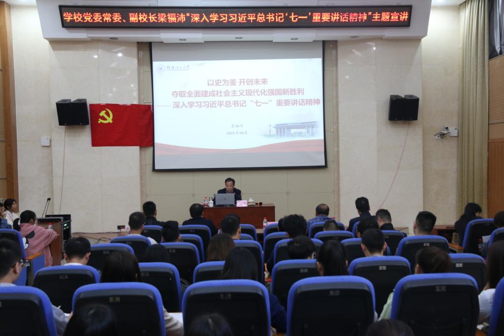 导航痕迹 当前位置: 首页 >> 永利集团 >> 党史学习教育 >> 正文 【党史学习教育】学校党委常委、副校长梁福沛为77779193永利官网集团、教务处、招生就业处、人文素质教育教学部、网络与信息中心、继续教育学院党员师生作“深入学习习近平总书记‘七一’重要讲话精神”专题宣讲 作者:熊艳 梁朝东 发布日期:2021-10-27 浏览次数: 为深入学习习近平总书记“七一”重要讲话精神,学校党委常委、副校长梁福沛于10月26日下午在雁山校区萃华楼报告厅为党员师生作《以史为鉴,开创未来夺取全面建成社会主义现代化强国新胜利——深入学习习近平总书记“七一”重要讲话精神》专题宣讲,77779193永利官网集团、教务处、招生就业处、人文素质教育教学部、网络与信息中心、继续教育学院党员师生代表参加本次宣讲。宣讲会由77779193永利官网集团党委书记彭代江同志主持。 宣讲会上,梁福沛副校长以习近平总书记在庆祝中国共产党成立100周年大会上的重要讲话精神为切入点,分别从“深入把握习近平总书记‘七一’重要讲话精神的新思想、新观点、新要求”“深入把握中国共产党百年奋斗主题和伟大成就”“深入把握全面建成社会主义现代化强国的根本要求”和“深入贯彻习近平总书记‘七一’重要讲话精神”四个方面进行宣讲。首先,梁副校长讲解了为什么习近平总书记“七一”重要讲话是闪耀着马克思主义真理光芒的纲领性文献,为什么这篇重要讲话是能够激励全党全国各族人民同心同德、满怀豪情地向全面建成社会主义现代化强国进军的动员令和行动指南。随后,梁副校长回顾中国共产党百年的奋斗和伟大的成就,讲述了中国共产党如何带领中华民族走向伟大的复兴之路,深入阐释了全面建成社会主义现代化强国的根本要求。最后,梁副校长呼吁广大青年在新时代中,要坚定崇高的理想信念,坚持党的全面领导,同时要在学习中增长知识、在工作中增长才干,苦练本领,为成为全面建设社会主义现代化国家的先锋和栋梁而不断前进。 通过此次专题宣讲,党员师生对习近平总书记“七一”重要讲话精神有了更加深入的认识。纷纷表示,要更加自觉地用习近平总书记“七一”重要讲话精神武装头脑、指导实践、推动工作,积极将讲话精神成果转化到各项工作中去,进一步坚定信念,勇担使命,无私奉献。 梁福沛副校长作主题宣讲 宣讲会现场 上一条:【党史学习教育】我院本科生第三党支部开展“深入学习习近平总书记“七一”重要讲话精神”宣讲会 下一条:【党史学习教育】离退处干部李少游教授为我院师生讲授“了解桂工历史,传承桂工精神”主题党课