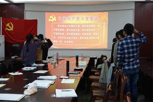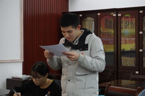 导航痕迹 当前位置: 首页 >> 永利集团 >> 不忘初心牢记使命 >> 正文 【不忘初心、牢记使命】学院本科生第一党支部召开接收预备党员大会 作者:赖廷民 发布日期:2019-12-08 浏览次数: 2019年12月6日晚,我院本科生第一党支部在12217会议室召开了接收预备党员大会。参与此次会议的有本科生第一党支部全体党员、预备党员及发展对象,大会由支部负责人陈楠主持。本次大会对接收何丽、陈文俊、郑靖萱、杨帆四名发展对象为支部预备党员进行讨论和表决。 会议伊始,由陈楠同志宣读大会议程并宣布大会开始。首先由四名发展对象分别上台陈述自己的入党动机、对党的认识以及向党组织汇报自己成为入党积极分子以来工作、学习、思想、生活上的转变。接着入党介绍人分别阐述发展对象的基本情况,并对其能否加入党组织表明态度,支委会向大会汇报发展对象的政治审查报告。随后支部党员指出四名发展对象存在的问题并进行提问,对其有更深的了解。接着由支部正式党员进行不记名投票,赖廷民同志监票,郑秋杏同志计票,陈楠同志宣布大会决议,何丽、陈文俊、郑靖萱、杨帆四名发展对象全票通过成为中共预备党员。大会最后,何丽、陈文俊、郑靖萱、杨帆四名预备党员面对党旗庄严宣誓,由支部党员同志为他们佩戴党员徽章。 陈楠同志表示,四名预备党员要牢记自己的政治生日,铭记自己的身份,在日常生活中严格要求自己,及时向党组织汇报思想,充分发挥一名党员的带头作用,不断改进自己,做一名副其实的共产党员。 李楠主持会议 黎江宣读政治审查报告 正式党员为预备党员佩戴党员徽章 全体党员对国旗宣誓 上一条:【不忘初心、牢记使命】我院积极开展“宪法宣传周”系列活动 下一条:【不忘初心、牢记使命】研究生第二党支部召开预备党员接收大会