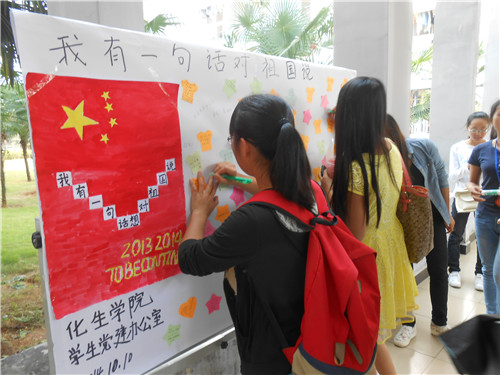 活动现场,党建办公室工作人员把前期收集好的便笺留言张贴到展板上供同学们浏览,阅读,同时也让同学们现场留言,寄托自己对祖国的热爱之情,获得得到同学们的积极参与,现场气氛热烈。