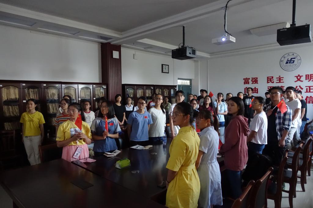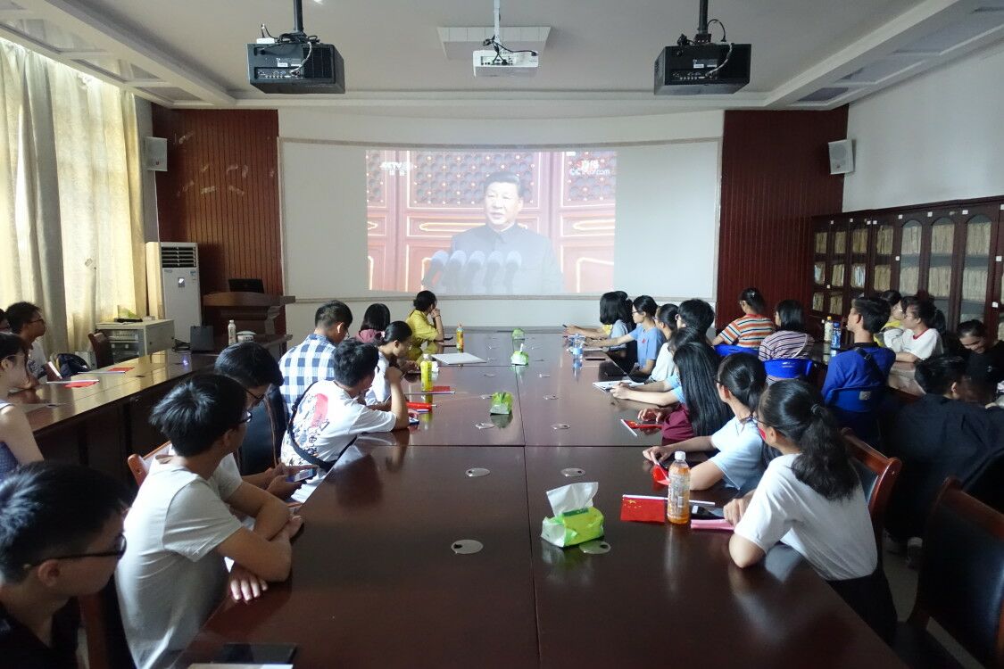 导航痕迹 当前位置: 首页 >> 学生工作 >> 学生活动 >> 正文 【厚德季·善学】我院组织师生观看庆祝中华人民共和国成立70周年阅兵式直播 作者:黄道坤 发布日期:2019-10-01 浏览次数: 2019年10月1日上午,庆祝中华人民共和国成立70周年大会、阅兵式、群众游行在北京天安门广场隆重举行。我院组织辅导员、学院各组织的学生骨干以及全体团支部书记在12217多功能会议室集中观看阅兵盛况直播。 习近平总书记在大会上讲话时强调,中国的昨天已经写在人类的史册上,中国的今天正在亿万人民手中创造,中国的明天必将更加美好。全党全军全国各族人民要更加紧密地团结起来,不忘初心,牢记使命,继续把我们的人民共和国巩固好、发展好,继续为实现“两个一百年”奋斗目标、实现中华民族伟大复兴的中国梦而努力奋斗!习近平总书记一句句掷地有声的话语,让与会师生们心潮澎湃,激情昂扬。 在阅兵式环节,受阅方队英姿飒爽的精神面貌、坚定豪迈的步伐和高精尖的武器装备引发了师生热烈讨论,纷纷表示将不忘初心,牢记使命,与伟大祖国共命运、同甘苦、齐担当,为实现中华民族伟大复兴贡献力量。 学院辅导员梁精华老师说:“作为一名辅导员,我对伟大中华人民共和国成立70周年阅兵仪式期待已久,祖国的发展,青年的昂扬,让我有一种感动油然而生。我们的祖国越发强大,我越发感到责任重大,当始终牢记立德树人根本任务,不忘初心、牢记使命,力争把青年大学生培养成眼里有光、心中有党、胸中有梦的新时代接班人。” 化学工程与工艺2017级学生李永树说:“70年披荆斩棘,70年风雨兼程,当我看到院校科研方队健步踏过,我脑海中始终环绕着震惊世界的青蒿素、超级水稻等伟大成就,让我动力十足。作为新时代的青年大学生,我会以学好专业知识为行动,为祖国腾飞注入青春血液。” 观看阅兵式对学院师生是一次生动的国防教育、爱国主义教育与理想信念教育,激发了爱国热情,振奋了民族精神,进一步增强了师生的民族自豪感和自信心。 化生学院师生收看阅兵式 化生学院师生起立唱国歌 化生学院师生观看阅兵式后合照 上一条:【厚德季·善学】学院召开团委、学生会干部建设会 下一条:【厚德季·善学】我院团委书记处、学生会主席团选举大会顺利举行
