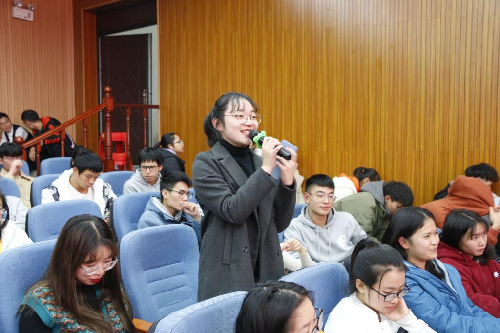 学院特别邀请两位已通过英语四六级的优秀学姐向同学们分享她们的经验。第一位来自公共管理与传媒学院社会工作2016-1班的林玉梅,她向我们分享了日常生活中如何充分利用课余时间学习英语,提高自己的听力水平,并向我们推荐了书虫系列读本。第二位是来自我院化工2018-卓越班的程夏,她向我们讲述了四级试题分值的分配,在考场上如何正确利用时间,掌握答题技巧,从而赢得高分。此外还分享了她的英文歌单以及英文电影,通过有趣的方式学习英语。在现场观众提问环节中,同学们积极踊跃地举手发言,两位学姐也耐心地解答。