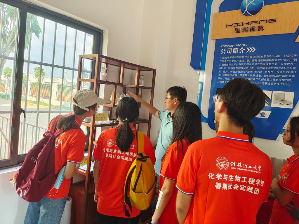 7月14日上午实践团成员来到了他们的最后一站——中铝广西有色稀土开发有限公司。在郭怀兵工程师的带领下,成员们走进实验室现场参观氧化锆产品的生产工艺流程。在实验室,团队成员同企业工作人员就ScSZ粉体的生产工艺设计进行了交流。通过企业工作人员的一番解答,团队成员对于稀土原材料加工和应用有了进一步的认识。