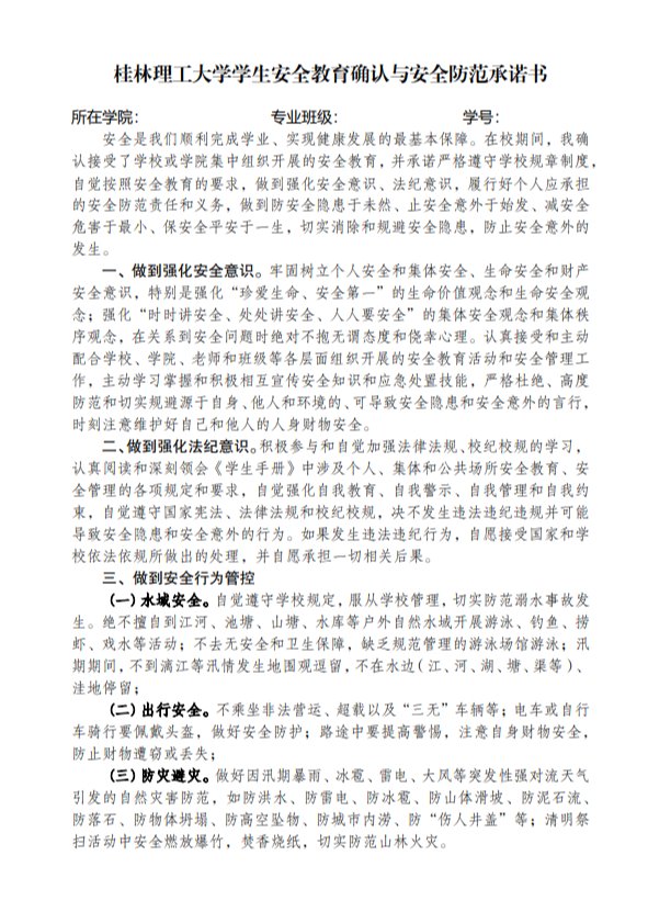 导航痕迹 当前位置: 首页 >> 学生工作 >> 学生活动 >> 正文 学院组织签订安全承诺书 作者:朱皓 发布日期:2021-09-15 浏览次数: 安全无小事,生命重如山。安全是一名大学生完成学业的重要保证,更是每一位大学生健康成长的基本条件,作为大学生,必须重视安全教育,增强自我保护意识,预防校园侵害,提高自护自救能力,针对当前普遍存在的大学生财产安全意识薄弱、轻信他人、财物保护观念差的现象,学院积极开展各项安全教育活动,组织全院学生签订安全承诺书,提高我院学生自我防范意识和能力。 在学生安全教育方面,我院一向高度重视,反复强调,通过各种形式提升学生自我安全意识。通过此次签署安全承诺书,进一步加强了同学们的安全意识和自我防范意识,今后,我院将把加强安全管理作为学院学生工作的基础,加强风险防控、夯实安全基础、压实安全责任、健全完善制度、消除安全隐患,为广大学生营造一个安全和谐的校园环境。 上一条:学院举行“听听我的心”活动 下一条:学院召开2021级研究生新生见面会暨实验室安全培训会
