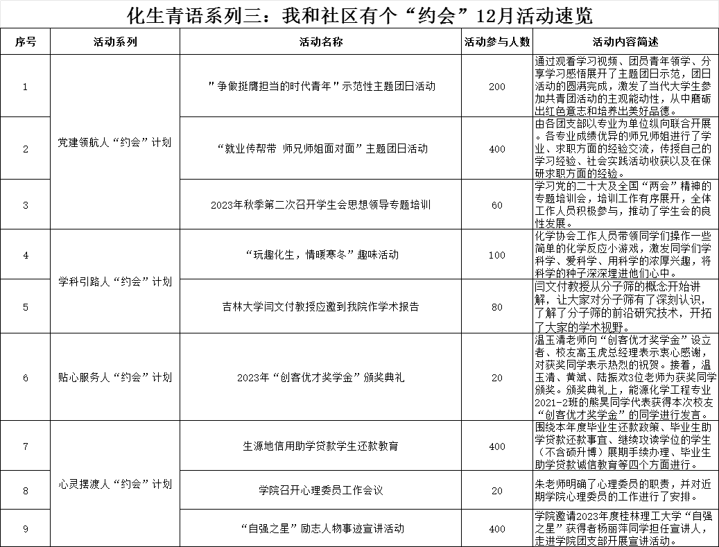 导航痕迹 当前位置: 首页 >> 学生工作 >> 学生活动 >> 正文 【化生青语】化生青语系列三:我和社区有个“约会”12月活动速览 作者: 发布日期:2023-12-31 浏览次数: 为扎实推进学校“一站式”学生社区综合管理模式建设试点工作和77779193永利官网集团“三全育人”综合改革工作,提升学院“一站式”学生社区影响力,77779193永利官网集团将“一站式”学生社区以“党建+X”模式为基础,结合学院【化生青语】育人文化,将学院育人体系下沉社区,打造【化生青语】系列三——我和社区有个“约会”特色活动。12月份,结合学院社区团队,按照学院社区我和社区有个“约会”特色品牌活动,党建领航人“约会”计划、学科引路人“约会”计划、贴心服务人“约会”计划、心灵摆渡人“约会”计划四个系列活动同步推进,共同助力学院学子学习、生活、就业等方面的发展。按照“约会计划”,学院举办活动如下。 (一审:张伟颀 二审:黄道坤 三审:李少华) 上一条:学院开展2024年本科生寒假离校安全专题教育 下一条:我院开展“自强之星”励志人物事迹宣讲活动