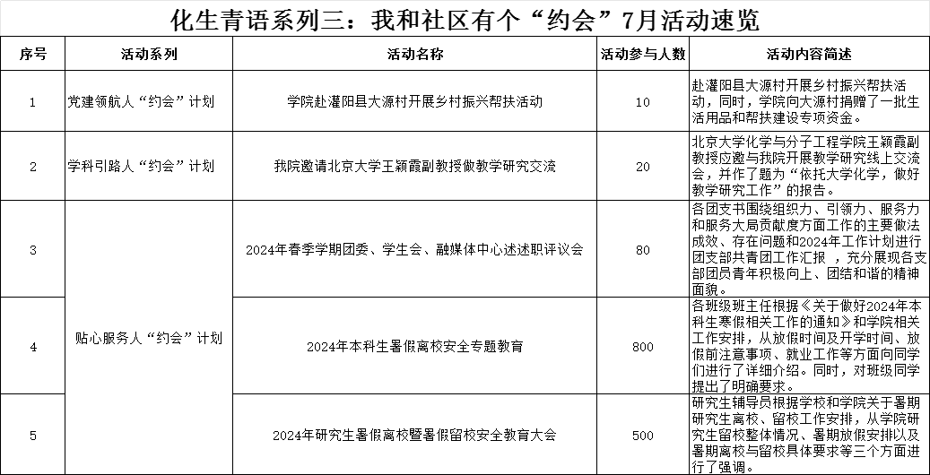 导航痕迹 当前位置: 首页 >> 学生工作 >> 学生活动 >> 正文 【化生青语】化生青语系列三:我和社区有个“约会”7月活动速览 作者: 发布日期:2024-07-19 浏览次数: 为扎实推进学校“一站式”学生社区综合管理模式建设试点工作和77779193永利官网集团“三全育人”综合改革工作,提升学院“一站式”学生社区影响力,77779193永利官网集团将“一站式”学生社区以“党建+X”模式为基础,结合学院【化生青语】育人文化,将学院育人体系下沉社区,打造【化生青语】系列三——我和社区有个“约会”特色活动。7月份,结合学院社区团队,按照学院社区我和社区有个“约会”特色品牌活动,党建领航人“约会”计划、学科引路人“约会”计划、贴心服务人“约会”计划三个系列活动同步推进,共同助力学院学子学习、生活等方面的发展。按照“约会计划”,学院举办活动如下。 (一审:陈千癸 二审:黄道坤 三审:李少华) 上一条:我院资助宣传大使开展暑期资助政策宣讲活动 下一条:【化生青语】化生青语系列三:我和社区有个“约会”6月活动速览