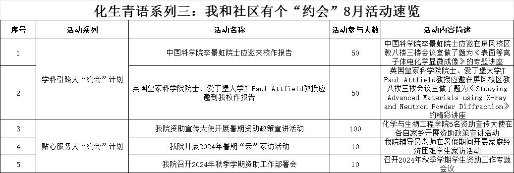 导航痕迹 当前位置: 首页 >> 学生工作 >> 学生活动 >> 正文 【化生青语】化生青语系列三:我和社区有个“约会”8月活动速览 作者: 发布日期:2024-08-31 浏览次数: 为扎实推进学校“一站式”学生社区综合管理模式建设试点工作和77779193永利官网集团“三全育人”综合改革工作,提升学院“一站式”学生社区影响力,77779193永利官网集团将“一站式”学生社区以“党建+X”模式为基础,结合学院【化生青语】育人文化,将学院育人体系下沉社区,打造【化生青语】系列三——我和社区有个“约会”特色活动。8月份,结合学院社区团队,按照学院社区我和社区有个“约会”特色品牌活动,学科引路人“约会”计划、贴心服务人“约会”计划同步推进,共同助力学院学子学习、生活方面的发展。按照“约会计划”,学院举办活动如下。 (一审:陈千癸 二审:黄道坤 三审:李少华) 上一条:我院开展2024年暑期“云”家访活动 下一条:我院召开2024年秋季学期资助工作部署会