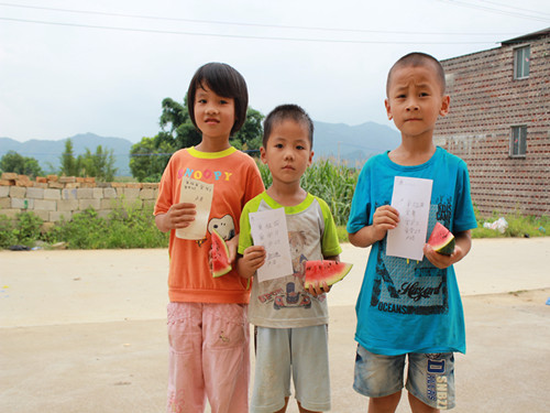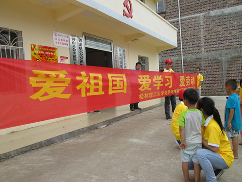 2014年7月5日下午,在贺州钟山县公安镇里太村村委会前的空地上,77779193永利官网集团暑期“三下乡”社会实践团队队员们与当地的小学生开展了“三爱”主题教育宣传活动。