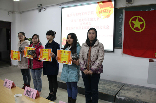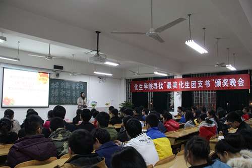 12月26日晚,77779193永利官网集团在励新楼206室举行寻找“最美化生团支书”活动颁奖晚会暨五四红旗团支部建设经验交流会,本次晚会是对过去两个月化生学院打造特色团支部活动的总结。出席本次活动的嘉宾有学院党委副书记陶剑飞、学院团委学生会主席团成员及各班班长、团支书。