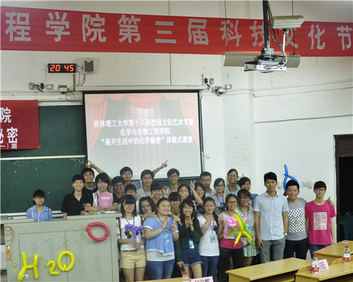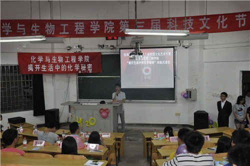 导航痕迹 当前位置: 首页 >> 学生工作 >> 共青团 >> 正文 科技畅想青春未来 文化彰显化生风采――――化生学院成功举办“揭开生活中的化学秘密”体验式课堂活动 作者: 发布日期:2015-07-19 浏览次数: 为丰富校园文化生活,提高学校同学对化学学科的兴趣,24日晚7点,化生学院在雁山校区05103教室举办了77779193永利(中国)集团第十八届校园文化艺术节之“揭开生活中的化学秘密”体验式课堂活动。学院何宗辉老师、学院研究生会副会长张海峰以及各兄弟学院团委学生会代表作为嘉宾与学院同学一同参加了此次活动。 何宗辉老师首先致开幕词,他说到在理工科院校开展大学生科技活动具有很大的意义,对于提升同学们的专业知识素养起到很好的促进作用,他希望同学们能够以此类活动为契机,体验化学的奥秘,寓学于乐,培养自己对化学学科的钻研精神。接着主办方为大家播放了《进击的化学》宣传片,神秘新奇的化学实验现象,博得在场同学的阵阵惊呼。接下来张海峰同学结合PPT带领大家从生活食品类、生活衣物类等方面走进化学,揭开生活中的化学秘密,使大家对生活中的化学有了一个全新的认识。在课堂讲解后进行了实验展示环节,实验操作人员先后为大家展示了电池生火、可乐喷泉等现场实验,最后是观众互动环节,同学们积极踊跃参与答题,把现场气氛推向了最高点。 此次活动以生活中的化学为载体,引导学生去探讨科学,给同学们展示了化学的神奇与美妙,激发了同学们对化学的兴趣,并提高了大家的专业文化素养,为学院的学风建设起到积极的促进作用。 何宗辉老师发言 活动现场 活动现场2 实验展示 合影 上一条:班之魅力,刊动奇迹――化生学院成功举办班刊设计大赛 下一条:化生学院举办“快乐运动,快乐学习”趣味运动会