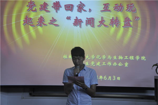 为了拓宽我们的知识面,改进学生的思想政治教育工作,加强自身的党性修养,促进学生全面和谐发展,6月3日晚,由我院学生党建办公室主办的党建带回家,互动玩起来之“新闻大转盘”活动在雁山校区05101室举行。学生党建办公室主任何宗辉老师、我院五大组织负责人、各支部负责人、本科党员以及入党积极分子参与此次活动。