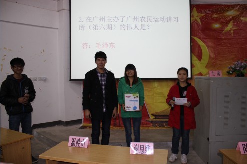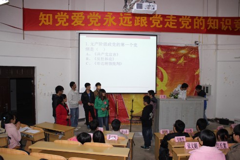导航痕迹 当前位置: 首页 >> 学生工作 >> 共青团 >> 正文 我院举办党知识竞赛活动 作者: 发布日期:2015-07-19 浏览次数: 为进一步引导我院党员、入党积极分子深入学习党团知识,加强党员、积极分子对党章、党史的认识和理解,提高学员的思想觉悟,我院本科一支部于11月29日晚上7:30在05101教室隆重举行“知党、爱党、永远跟党走”为主题的党知识竞赛。学院12级辅导员何宗辉老师及各支部代表、各年级同学到场观看了比赛。 本次党知识竞赛分为预赛、复赛、决赛三部分。预赛中从120多名报名选手中选拔出25名进入复赛。在复赛环节中,各组选手从容淡定、认真作答,比赛现场气氛异常高涨。为缓解紧张气氛,比赛还穿插观众抢答环节。在决赛环节,各选手精彩的发挥赢得在场观众阵阵掌声。最终,生物12-1班的蔡玉梅同学脱颖而出,获得第一名,同时还评出二等奖、三等奖若干名。 比赛现场(一) 比赛现场(二) 何宗辉老师为获奖选手颁奖 活动结束后合影 上一条:化生学院举办新生宿舍装饰大赛 下一条:我院本科一支部深入学习十八届三中全会精神