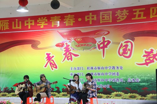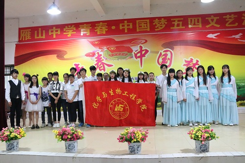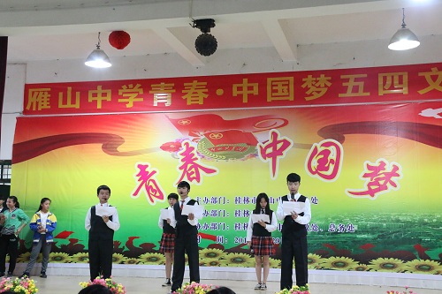 奉献是青春的精神,担当是青春的使命。为纪念“五四运动”97周年,继承和发扬“五四运动”的光荣传统,激励青年团员积极向上,乐观进取的精神,凝聚青年团员的智慧和力量,5月4日,我院团委学生会组织志愿者与桂林市雁山中学一同举办“雁山中学青春·中国梦五四文艺汇演”活动。