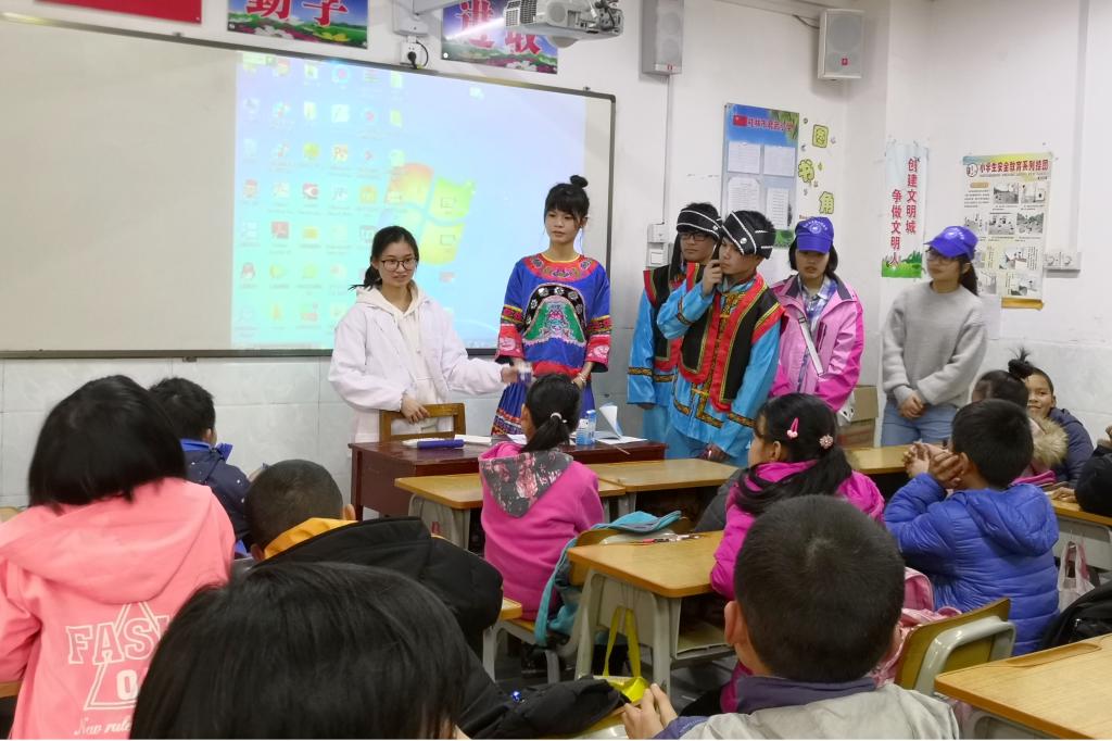 活动伊始,志愿者们从学校东门步行出发前往君武小学,在步行半小时后顺利到达目的地。而后在君武小学相关领导老师的安排下,志愿者们有序进入君武小学。紧接着到场的志愿者们按原先的安排分成了四部分分别进入四个班级,为同学们上了一堂生动、精彩的壮族文化及化学知识科普课。在课上,担当讲师的志愿者通过PPT介绍了三月三特色文化活动,期间由身着壮乡服饰的志愿者进入课堂,让小朋友们亲身感受壮乡服饰、饰品等。随后通过视频的形式,向他们展示了化学反应中的奇妙世界,同时穿插有奖问答环节,激发同学们对化学知识学习的积极性。志愿者们也将“实验室”搬到了同学们的教室,与同学们一起进行实验操作,比如酚酞变色实验,让他们在娱乐中领略化学的魅力。