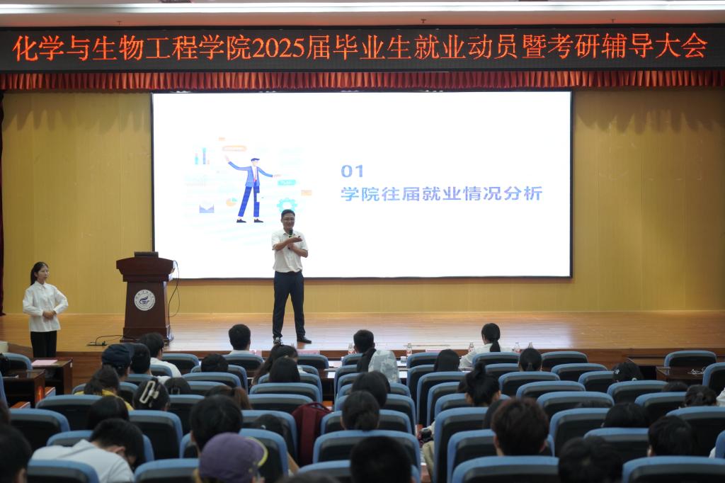 导航痕迹 当前位置: 首页 >> 招生就业 >> 就业 >> 正文 学院2025届毕业生就业动员暨考研辅导大会顺利召开 作者: 发布日期:2024-10-16 浏览次数: 10月16日中午,学院在雁山校区图书馆报告厅召开了2025届毕业生就业动员暨考研辅导大会。学院党委书记彭代江,院长匡小军,党委副书记李少华,副院长李霞、何方、孔翔飞出席,2021级辅导员陈千癸、2024届优秀毕业生苏宸及2025届本科生参加。 会上,学院党委书记彭代江发言。彭书记强调了就业和考研对于同学们个人成长和未来发展的重要性,提醒同学们在面对就业市场时要保持积极主动的心态,不仅要密切关注行业动态,更要不断提升自我,增强竞争力,以最佳状态迎接未来的挑战。同时,彭代江对2025届学子提出了三点要求:一是要坚定信念,不忘初心,始终保持对梦想的执着追求;二是要勤奋学习,提升自我,用知识和能力武装自己;三是要勇于担当,甘于奉献,以高度的责任感和使命感回馈社会。他希望,同学们在追求梦想的过程中,要保持良好的心态和健康的身体,以坚定的信念和不懈的努力,实现自己的人生目标。 学院党委副书记李少华结合学院近三年的就业数据对当前就业市场的特点和趋势进行了分析。他指出,同学们要树立正确的就业观,根据自身实际情况,精准定位,脚踏实地,不盲目追求不切实际的目标,一步一个脚印地为自己的未来努力拼搏。学院副院长孔翔飞从学院近三年考研报考及录取情况出发,为同学们提供了考研院校选择策略。他指出,同学们要合理评估自身水平,结合往年考研形势,确立符合自身的目标,提升考研成功率。 随后,往届毕业生苏宸分享了他的考研经验,他鼓励考研同学们要相信自己,勇敢追梦,争取“一战上岸”。2025届毕业生代表陈陶作了就业表态发言,他代表毕业生表示,在人生新的征程上要积极转变心态,努力提升技能,不断充实自我,在未来的路上稳步踏实前行。会上,学院还为2025届考研学子发放了慰问品。 此次就业动员暨考研辅导大会不仅为2025届毕业生提供了宝贵的就业指导和考研建议,也进一步增强了大家的信心和决心。学院将继续关注毕业生的就业和考研情况,提供全方位的支持和服务,助力同学们实现美好未来。 学院党委书记彭代江发言 学院党委副书记李少华作就业形势分析 学院副院长孔翔飞作考研报考院校分析 2024届优秀毕业生作考研经验分享 (一审:陈千癸 ;二审:黄道坤; 三审:李少华) 上一条:学院召开2024年大学生职业规划大赛动员大会 下一条:学院举办2025届就业引航宣讲会,助力学子从容迎就业