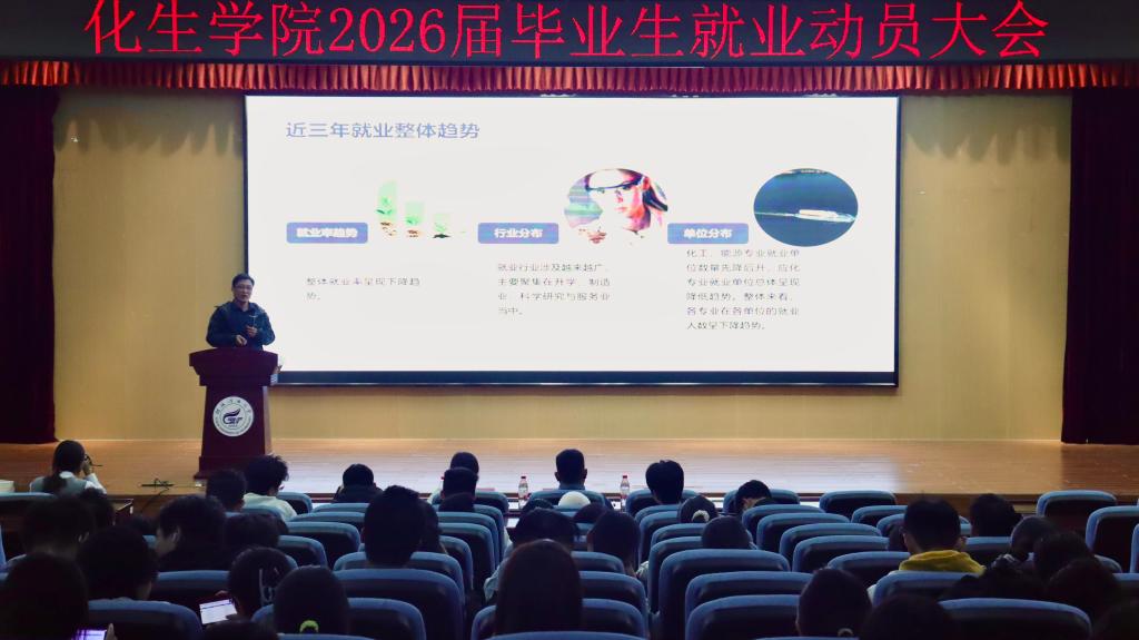 导航痕迹 当前位置: 首页 >> 招生就业 >> 就业 >> 正文 学院召开2026届毕业生就业动员大会 作者:陈千癸 发布日期:2025-10-23 浏览次数: 10月22日,学院在图书馆报告厅召开2026届毕业生就业动员大会。学院党委书记彭代江、党委副书记李少华、辅导员陈千癸及2026届全体本科生参加会议。 会上,2026届毕业生王聪辉同学围绕简历制作、建立求职台账和面试复盘三个方面分享了自己的求职经验。党委副书记李少华结合学院近三年就业情况作了就业形势分析。他指出就业市场多元化且竞争激烈,建议同学们拓宽就业领域、提升职业规划意识、强化职业技能。 最后,学院党委书记彭代江作总结发言。他结合近三年就业形势及2025年秋季学期首场双选会的情况,指出企业看重专业知识学习能力、专业实验操作能力和个人发展潜力。彭书记对同学们提出三点期望:了解形势、理性规划;夯实基础、提升竞争力;主动出击、把握机会。他还表示,学院会一如既往地全力支持毕业生就业。 本次就业动员大会促进了学院与学生的深度沟通,便于精准把握学生需求,优化就业服务,完善就业工作体系,为后续就业工作的开展筑牢根基。 学院党委书记彭代江发言 学院党委副书记李少华作就业形势分析 玉聪辉同学作经验分享 一审:陈千癸;二审:黄道坤;三审:李少华 下一条:学院开展2025年秋季学期就业帮促系列活动