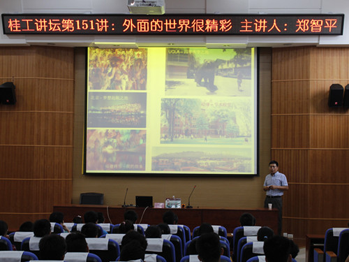导航痕迹 当前位置: 首页 >> 新闻资讯 >> 学院新闻 >> 正文 【桂工讲坛】第151讲 郑智平教授做客桂工讲坛 作者: 发布日期:2015-07-13 浏览次数: 为了开阔我院学生的视野,激励同学们奋发学习, 7月10日下午3点,我院邀请到亚利桑那大学郑智平教授为在雁山12栋报告厅我院学子做了题为“外面的世界很精彩”的讲座。此次讲座由李建平院长主持,化工12级同学和研究生同学到场聆听。 讲座伊始,郑智平教授就提出了“人生在世,心灵和身体必须有一个在路上,精彩的走一遭”的倡议。随后他用幽默的语言、结合优美的图片,给我们介绍了美国、智利以及一些国外的高等学府的基本情况,向我们展示了外面世界的风光以及文化,赢得同学们阵阵掌声。随后,他结合自己的学习历程以及多年海外留学的经验,鼓励大家在大学里努力学习、学会交往、学会独立、学会担当,成为一个对社会有用的人。最后,郑智平教授还解答了同学们在学习、生活以及专业上遇到的问题 。 讲座现场 上一条:我院在第十四届“挑战杯”全国大学生课外学术科技作品竞赛专项赛中获佳绩 下一条:【桂工讲坛】河南工业大学朱春山教授应邀到我院做学术报告
