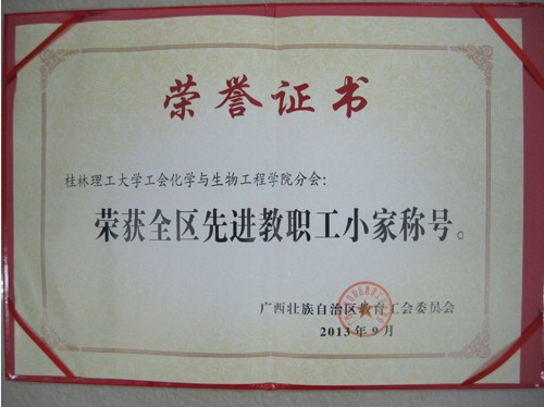 导航痕迹 当前位置: 首页 >> 新闻资讯 >> 学院新闻 >> 正文 我院分工会荣获“全区先进教职工小家”称号 作者: 发布日期:2013-12-22 浏览次数: 日前,自治区教育工会对全区教育系统基层工会工作中涌现出的先进集体和先进个人予以表彰,我院分会荣获“全区先进教职工小家”称号。在学校党委、行政的正确领导和校工会的大力支持下,近年来,我院领导高度重视,始终坚持围绕学校工作大局,本着“服务教工、服务学院、服务学校”的宗旨,科学有效地开展各项工作,积极组织引导教职工开展形式多样、有益身心的活动,切实维护保障教职工合法权益,广泛深入持久地开展建设教职工之家、教职工小家活动。我院全体教工团结协作,积极投身学校的各项工作,在教学和科研方面取得多项成果,为建设特色鲜明高水平理工大学作出了应有的贡献。荣誉证书 上一条:我院举行2013级化工卓越班导师见面会 下一条:【群众路线教育实践】 化生学院召开党的群众路线教育实践活动工作布置会