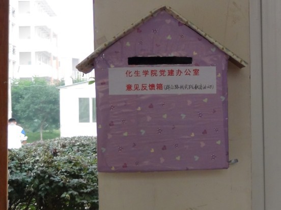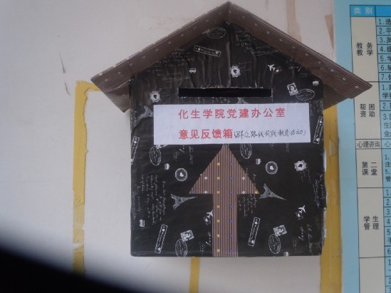导航痕迹 当前位置: 首页 >> 新闻资讯 >> 学院新闻 >> 正文 【群众路线教育实践】 化生学院设立党的群众路线教育实践活动征求意见箱 作者: 发布日期:2013-10-31 浏览次数: 为切实推进我院党的群众路线教育实践活动,推动我院各项工作科学发展,进一步落实密切联系同学、服务同学的工作机制:坚持服务于同学、问需于同学、问计于同学,切实做到知同学情、解同学忧、暖同学心。本着“畅所欲言,集思广益”的原则,10月22日,我院学生党建工作办公室在雁山校区12210学院学工办门口、女生宿舍4A一楼楼下公布栏、男生宿舍7#一楼楼下公布栏分别设立了意见反馈箱以及设立专用电子信箱账号:hsxyxsdjbgs@163.com 。面向全院广泛征求党员和群众的意见和建议。同学们可以以信件、便条及邮件的形式,从生活,学习,工作等方面,就学校管理工作和有关学校发展的各类问题提出意见和建议。意见箱收集的意见,建议和反映的问题,将由我院学生党建工作办公室安排专人管理,定期收集、整理意见信息,并分类向相应部门和有关学校领导反映,切实做到民心所向,把同学们的真实想法如如实实的反映出来。相信通过设立学生意见箱,能进一步了解同学们的心声,实现密切联系同学,服务同学,使同学得到更多实惠这一目的。同时也将拓宽同学们和学校之间的沟通渠道,充分发挥舆论监督作用,强化同学们的主人翁责任意识,调动同学们参与学校教育教学、管理服务工作的积极性,为学校发展献计献策。 女生宿舍4A一楼设立的意见反馈箱学院学生工作办公室门口设立的意见反馈箱男生宿舍7#设立的意见反馈箱 上一条:我院教师参加第十七届中国化学会有机与生物分析研讨会 下一条:喜讯:我校学子在广西高校大学生化学实验技能竞赛中喜获佳绩