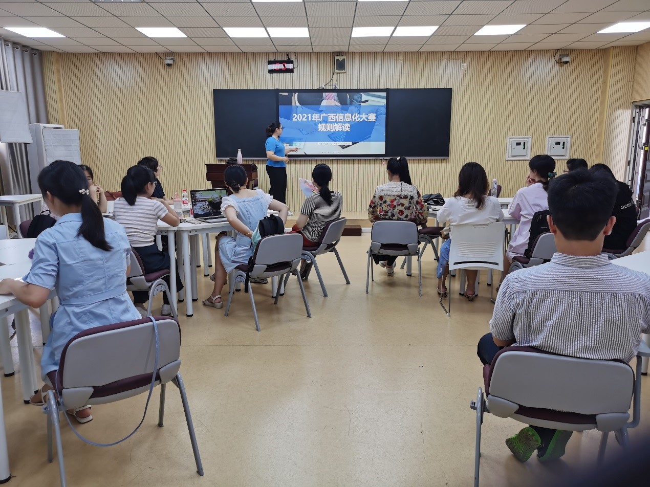 为给我院参加“2021年第二十届广西高校教育教学信息化大赛”的老师们全面熟悉和理解大赛规则,7月13日上午在屏风校区9502,我院组织开展2021年广西信息化大赛规则解读培训会,此次培训会邀请到网络与信息中心的陶雁羽老师进行现场讲解和答疑,参加本次培训会的有我院参赛的7位教师及感兴趣的教师,同时还吸引了外国语学院、土木与建筑工程学院、商学院和旅游与风景园林学院等10多位教师参加,会议由院长助理聂瑾芳主持。