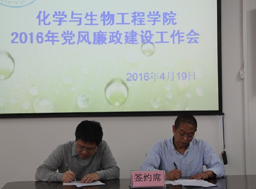 学院党委书记梁军(右)与生物工程教工党支部书记李培骏(左)签订2016年党风廉政责任状