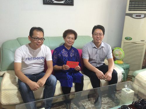 梁军书记(右)、陶剑飞副书记(左)慰问退休教师胡祖生(中)