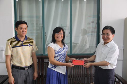 李建平院长(右)、潘宏程副院长(左)慰问退休教师陶慧林(中)