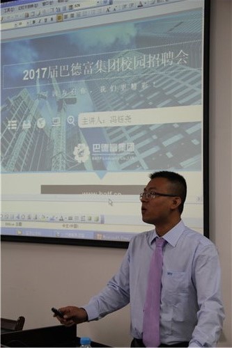 2016年10月13日上午,巴德富实业有限公司华西领事冯钰尧一行4人来到我院召开专场招聘会。宣讲会在雁山12217会议室召开,共有来自我院化学工程与工艺、应用化学、化学工程、分析化学等本科及硕士生共80余人参加了招聘会。