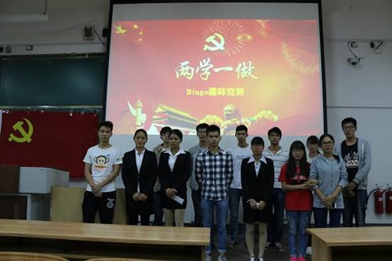 导航痕迹 当前位置: 首页 >> 新闻资讯 >> 学院新闻 >> 正文 【两学一做】寓乐于学——我院成功举办《“两学一做”Bingo趣味竞赛》活动 作者:何宗辉 发布日期:2016-10-20 浏览次数: 为推动“两学一做”学习教育深入开展,加深我院学生党员和入党积极分子对党的基本知识、习近平总书记重要讲话精神的认识,10月18日晚,由学院本科生第三党支部及学生党建工作办公室承办的“两学一做”Bingo趣味竞赛在雁山06207教室顺利举行。学院党委副书记陶剑飞、团委书记饶筠筠、16级辅导员何宗辉、学院团委副书记赵启迪、楼管委主任黄志钦应邀出席本次活动,学院七个学生党支部的所有正式党员、预备党员,大一大二积极分子参与了本次活动。 活动开始,陶剑飞老师上台发言,她对本次活动的意义表示肯定,希望通过比赛,能够帮助大家更加深入地掌握党的思想精髓,提高党组织在我院学生中的影响力和凝聚力,也进一步激发同学们向党组织靠拢的决心。同时,她也希望各位学生党员在接下来的学习生活中,自觉践行“两学一做”学习教育,做好自身的同时,充分发挥先锋模范带头作用,共同为学院的学风建设、各项事业贡献力量。 本次比赛,我院共7个学生支部参赛,每个支部派出3人。比赛以每两个支部PK四方格、九方格答题的形式开展,答对一题占据一个格子,最先连成一条直线的支部进入下一轮。比赛围绕《中国共产党章程》、《中国共产党廉洁自律准则》、《中国共产党纪律处分条例》、《中国共产党党员权利保障条例》《习近平总书记系列重要讲话读本(2016年版)》等,并结合当前党和国家的重大纪念活动及广西地方党史进行。 比赛赛况起伏不断,整体的气氛十分活跃。无论是参赛选手,还是观众,都能积极的参与到答题中去,在独特的比赛形式下,对自己的党务知识进行检验,展示自己的理论水平。经过了激烈的角逐,在最后一轮的决赛中,本科第二党支部险胜本科第三党支部,取得了最终的胜利。 最后,何宗辉老师为获奖支部颁发奖状,并总结到:活动的举办是短暂的,能学到的东西都是有限的,但是,希望大家能够保持自己学习的劲头,积极的去提升自己,时刻不忘学习,切实提高自己的党性觉悟。 本次活动有效调动了大学生党员和入党积极分子学习党章党规和习近平同志系列重要讲话精神内容的主动性和自觉性,教育引导学生党员尊崇党章、遵守党规,进一步坚定理想信念,切实增强责任感和使命感,真正做到爱党护党为党,营造“爱党、学党、入党”的良好氛围。 党委副书记陶剑飞、团委书记饶筠筠、党建办主任何宗辉出席活动 何老师发言 何老师为获奖党员颁发奖状 活动现场 合影留念 上一条:宁波联凯世通有限公司招聘信息 下一条:生物工程教研室召开学科建设工作会议