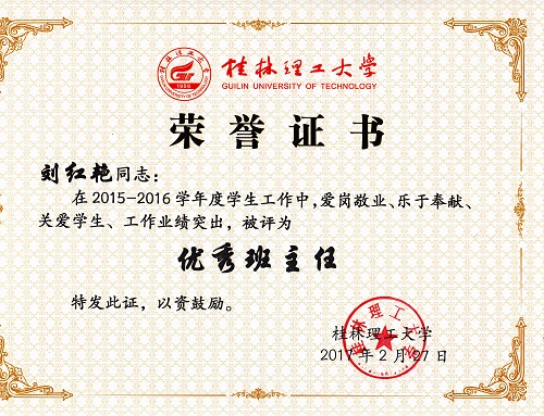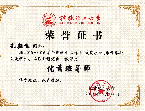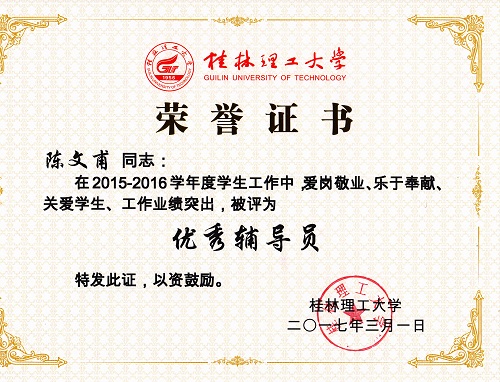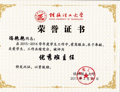 导航痕迹 当前位置: 首页 >> 新闻资讯 >> 学院新闻 >> 正文 我院教师获2016年度“优秀班主任”“优秀班导师”“优秀辅导员”荣誉称号 作者:李冲 发布日期:2017-03-08 浏览次数: 在我校2016年度优秀辅导员、优秀班导师和优秀班主任评选工作中,我院教师孔翔飞获“优秀班导师”称号,刘红艳、冯艳艳获“优秀班主任”称号,陈文甫、李冲获“优秀辅导员”称号。 本次评选,经个人申请,学院推荐,学校学生工作领导小组评定、审核而定,共评选出优秀辅导员22名,优秀班导师、优秀班主任72人。 上一条:我院刘勇平等教师获2016年度“就业工作先进个人”荣誉称号 下一条:我院召开2017年春季学期学生工作布置会