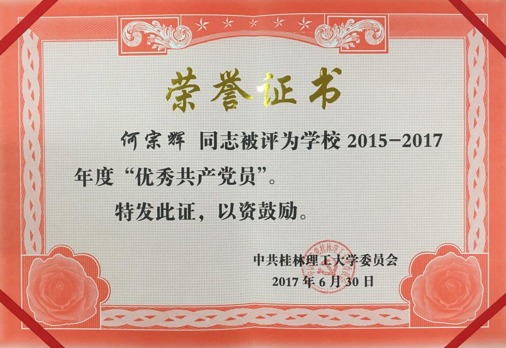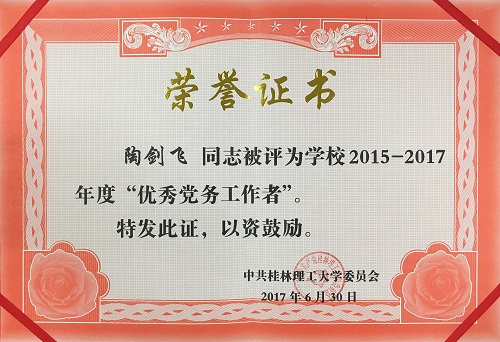导航痕迹 当前位置: 首页 >> 新闻资讯 >> 学院新闻 >> 正文 我院部分党员在学校“庆祝中国共产党成立96周年主题党日活动暨先进表彰大会“获得表彰 作者:李冲 发布日期:2017-07-02 浏览次数: 6月30日下午,我校在屏风校区体育馆三楼举行庆祝中国共产党成立96周年主题党日活动暨先进表彰大会。校党委书记张学洪在会上讲话,校长解庆林主持会议,党委副书记王赣华宣读表彰决定,党委副书记、纪委书记孙宁宣布学校党风廉政建设优秀成果评选结果。校领导梁福沛、曾繁荣,全体教工党员,学生党员代表,民主党派和无党派人士代表参加会议。 会上,学校对获得2015-2017年度先进的10个基层党组织、45名优秀共产党员、10名优秀党务工作者,以及14个党风廉政建设优秀成果获奖单位、11个庆祝建党96周年主题党日活动获奖单位进行表彰。我院陶剑飞副书记获得“优秀党务工作者”荣誉称号;李霞、何宗辉获得“优秀共产党员”荣誉称号。 荣誉证书(一) 荣誉证书(二) 荣誉证书(三) 上一条:我院召开2017年春季末学期班主任工作会议 下一条:我院何宗辉老师参加高校创业指导师专题培训班