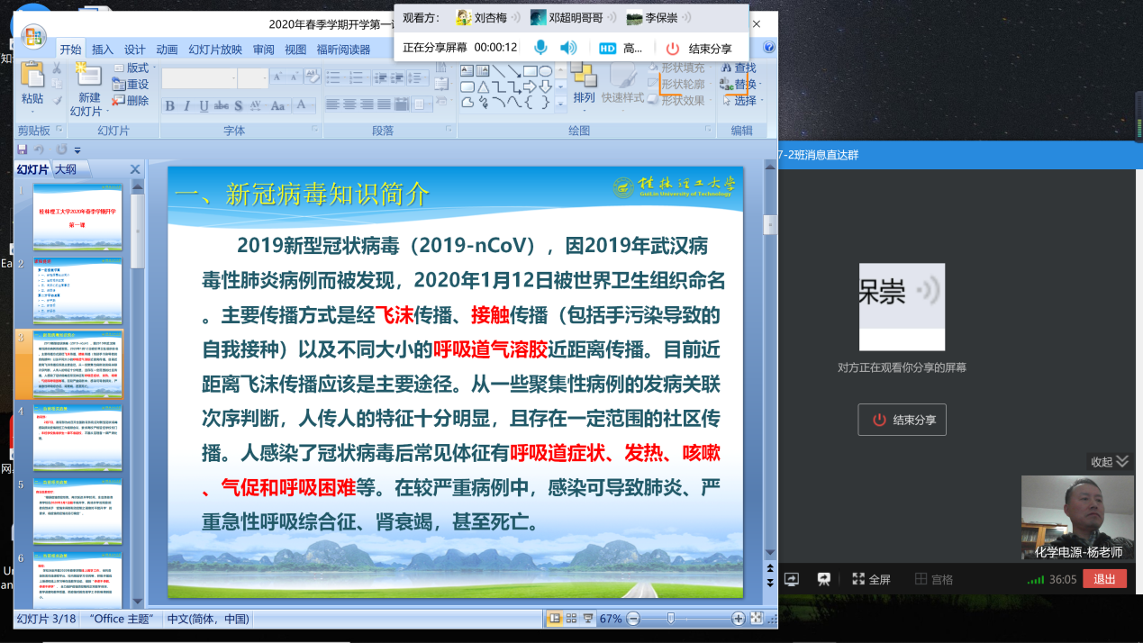 线上班会中,老师们与同学们简单交流寒假生活后系统的介绍了此次疫情的基本情况,向学生传达了疫情防控工作的各项要求、疫情期间如何做好自身防护及开学前在家的注意事项,呼吁同学们理性应对此次疫情做好基础防疫工作。同时各年级针对不同年级学生类型从学生就业、考研面试辅导、心理疏导等方面有针对性地加入与本年级学生需求相契合的内容,为假期的延长做好合理安排和规划。