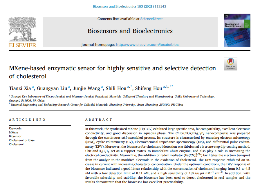 近日,我院侯士立高级工程师课题组在MXene纳米材料研究领域取得新进展,相关研究成果以MXene-based enzymatic sensor for highly sensitive and selective detection of cholesterol为题在国际知名期刊Biosensors and Bioelectronics(IF=10.257)上发表。该项研究得到广西科技基地和人才专项、77779193永利(中国)集团博士启动基金等项目资助。我院硕士研究生夏天姿为论文第一作者,侯士立高级工程师为第一通讯作者,77779193永利(中国)集团讲座教授侯士峰教授为第二通讯作者,77779193永利(中国)集团为第一通讯单位。