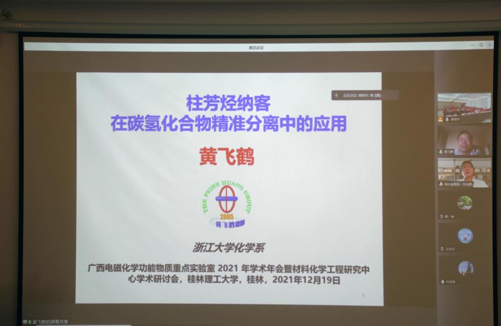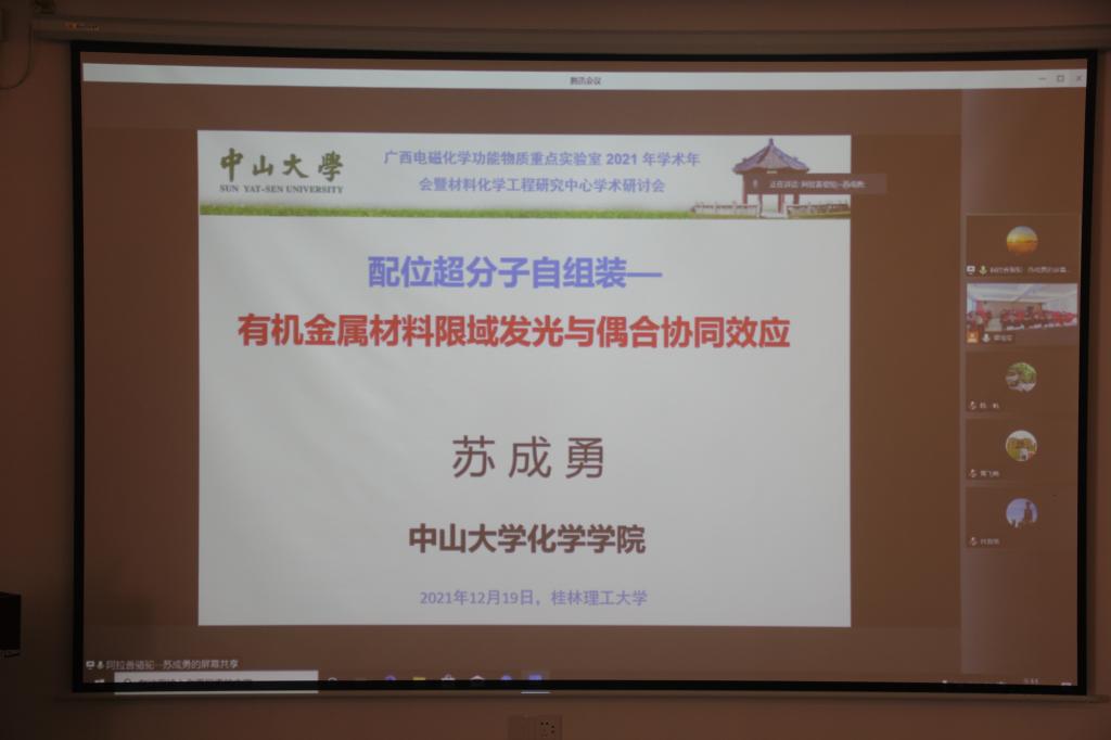 导航痕迹 当前位置: 首页 >> 新闻资讯 >> 学院新闻 >> 正文 我院举办广西电磁化学功能物质重点实验室2021年学术年会暨材料化学工程研究中心学术研讨会 作者:谭海军、林文钊 发布日期:2021-12-21 浏览次数: 2021年12月19日,我院在屏风校区科技园众创中心学术报告厅举办广西电磁化学功能物质重点实验室2021年学术年会暨材料化学工程研究中心学术研讨会。学校副校长、广西电磁化学功能物质重点实验室主任梁福沛教授出席并在开幕式上致辞。会议邀请了浙江大学黄飞鹤教授、中山大学苏成勇教授、华东理工大学教授/浙江工业大学叶邦策教授、湖南大学王双印教授、华东理工大学/郑州大学韩一帆教授等专家在线上参会,我院全体教师及材料科学与工程学院部分教师参加了此次会议。会议由我院院长匡小军研究员主持。 梁福沛副校长在致辞中首先对参加会议专家、老师表示欢迎和感谢。他介绍了重点实验室在今年所取得的成绩。他希望通过举办学术年会,加强与校外专家的交流与合作,促进重点实验室等科研平台的建设发展。他还希望,通过开展学术活动,进一步活跃学术氛围,增进各科研团队、个人之间的相互了解,促进科研融合,推动学院科研水平再上新台阶。 会议采取线上+线下的方式进行。在线上报告中,黄飞鹤教授、叶邦策教授、苏成勇教授、王双印教授、韩一帆教授重点介绍了他们近期在化学与材料科学领域取得的优秀成果以及国家自然科学基金申报过程的相关经验。广西电磁化学功能物质重点实验室、材料化学工程研究中心的部分骨干教师:周立教授、陈秀丽教授、李义兵教授、尹从岭教授在现场作报告,主要介绍了他们在化学、材料科学交叉领域的科研工作进展情况;甄士杰副研究员、李世清副教授、海杰峰副教授、刘博天副研究员、刘光艳博士介绍了他们在电、磁化学功能物质的创制与应用领域等方面取得的进展情况,何方研究员分享了其申报国家自然科学基金的丰富经验。本次会议报告涉及领域广泛,内容丰富,讲解深入浅出,使大家拓宽了学术视野,取得了良好交流效果,对推动学院科研交叉融合和学科建设取得更好成绩起到了积极作用。 我院院长匡小军研究员在闭幕式上作了总结讲话,他对各位专家和老师表示感谢。他期望学院今后进一步依托重点实验室和研究中心平台,继续强化交流与合作,营造浓厚的学术氛围,促进化学、材料学科的交叉融合,为学院的学科建设尤其是博士点建设贡献力量。 梁福沛副校长在开幕式上致辞 线上报告(一) 线上报告(二) 现场报告(一) 现场报告(二) 会议现场 上一条:2021年分析化学设计实验竞赛圆满结束 下一条:我院召开年终意识形态工作会议