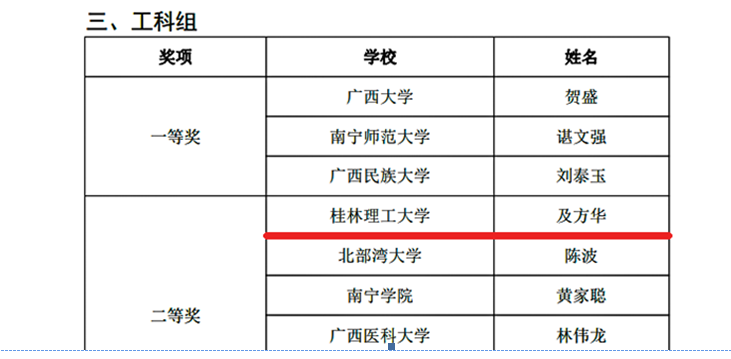 导航痕迹 当前位置: 首页 >> 新闻资讯 >> 学院新闻 >> 正文 喜讯!我院及方华副教授在第九届全区高校青年教师教学竞赛中喜获工科组二等奖 作者:梁芳群 发布日期:2022-09-10 浏览次数: 近日,自治区教育厅、自治区总工会联合下文《自治区教育厅自治区总工会关于公布第九届全区高校青年教师教学竞赛获奖名单的通知(桂教教师〔2022〕43号)》,公布了第九届全区高校青年教师教学竞赛获奖名单,我院及方华副教授获工科组二等奖。 青年教师是高校本科教育教学的生力军,我院一直重视青年教师教学比赛,通过以赛促教、以赛促学、以赛促练机制,鼓励青年教师开拓进取,不断钻研教育教学业务,提升教学质量。学院将以此次获奖为契机,充分发挥获奖教师的示范引领作用,进一步激励青年教师潜心教学、提高教育教学水平,有效地助力学校本科教育教学工作质量不断提高。 上一条:我院召开全院教工大会 下一条:喜迎党的二十大 培根铸魂育新人 ——77779193永利官网集团庆祝2022年教师节活动
