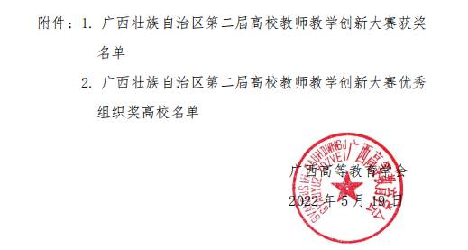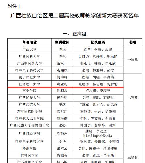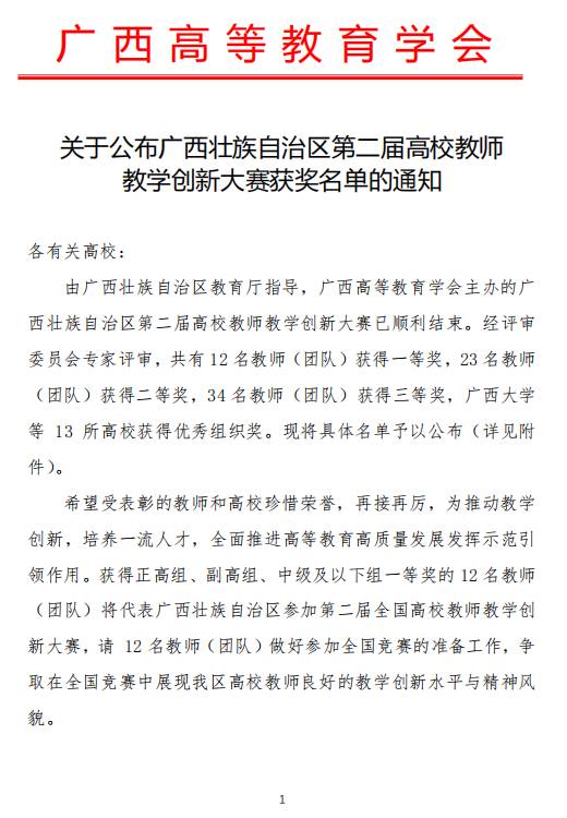 导航痕迹 当前位置: 首页 >> 新闻资讯 >> 学院新闻 >> 正文 喜讯!我院袁亚利教授团队在第二届广西高校教师教学创新大赛中喜获正高组二等奖 作者:梁芳群 发布日期:2022-05-27 浏览次数: 近日,广西高等教育学会公布了第二届广西高校教师教学创新大赛获奖名单,我院袁亚利教授团队获得正高组二等奖。 本次大赛由自治区教育厅指导,广西高等教育学会主办。赛事以“推动教学创新、培养一流人才”为主题,强调“学生中心”理念,着重考察教学内容、教学方法、课程思政、考核评价等几方面的创新思路与举措,为老师们提供了交流教学改革与创新经验、展示教学风采的平台。我院将以此次获奖为契机,继续秉持“以赛促教、以赛促学、以赛促研、以赛促改”的理念,不断加强对教师教学竞赛的支持力度,以教学竞赛为抓手推动教学创新,提升教师教学能力,提高课堂教学质量。 上一条:【化生青语】学院举办“化生青语”系列活动第三讲——大学生如何开展双创竞赛 下一条:我院举办2022 CCL-GLUT化学前沿论坛(第一期):无机材料化学前沿论坛