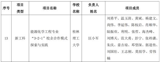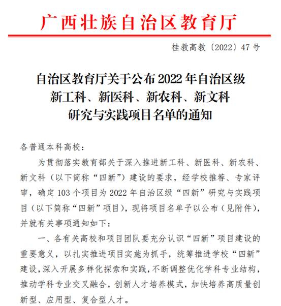 导航痕迹 当前位置: 首页 >> 新闻资讯 >> 学院新闻 >> 正文 喜讯!我院获批广西新工科研究与实践项目1项 作者:梁芳群 发布日期:2022-09-24 浏览次数: 近日,广西教育厅印发《自治区教育厅关于公布2022年自治区级新工科、新医科、新农科、新文科研究与实践项目名单的通知》(桂教高教〔2022〕47号),我院新工科项目《能源化工专业“3-2-1”校企合作模式探索与实践》获得立项。 “四新”建设是建设高等教育“质量中国”的战略一招、关键一招、创新一招,是高等教育人才培养的“中国方案”,是高等教育高质量发展的战略布局。学院将进一步深入开展多样化探索和实践,不断调整优化学科专业结构,推动学科专业交叉融合,创新人才培养模式,全力提升专业人才培养质量和服务经济社会发展能力。 上一条:我院召开安全稳定工作会议 下一条:军训送清凉,关爱暖人心——我院开展“军训送清凉”活动