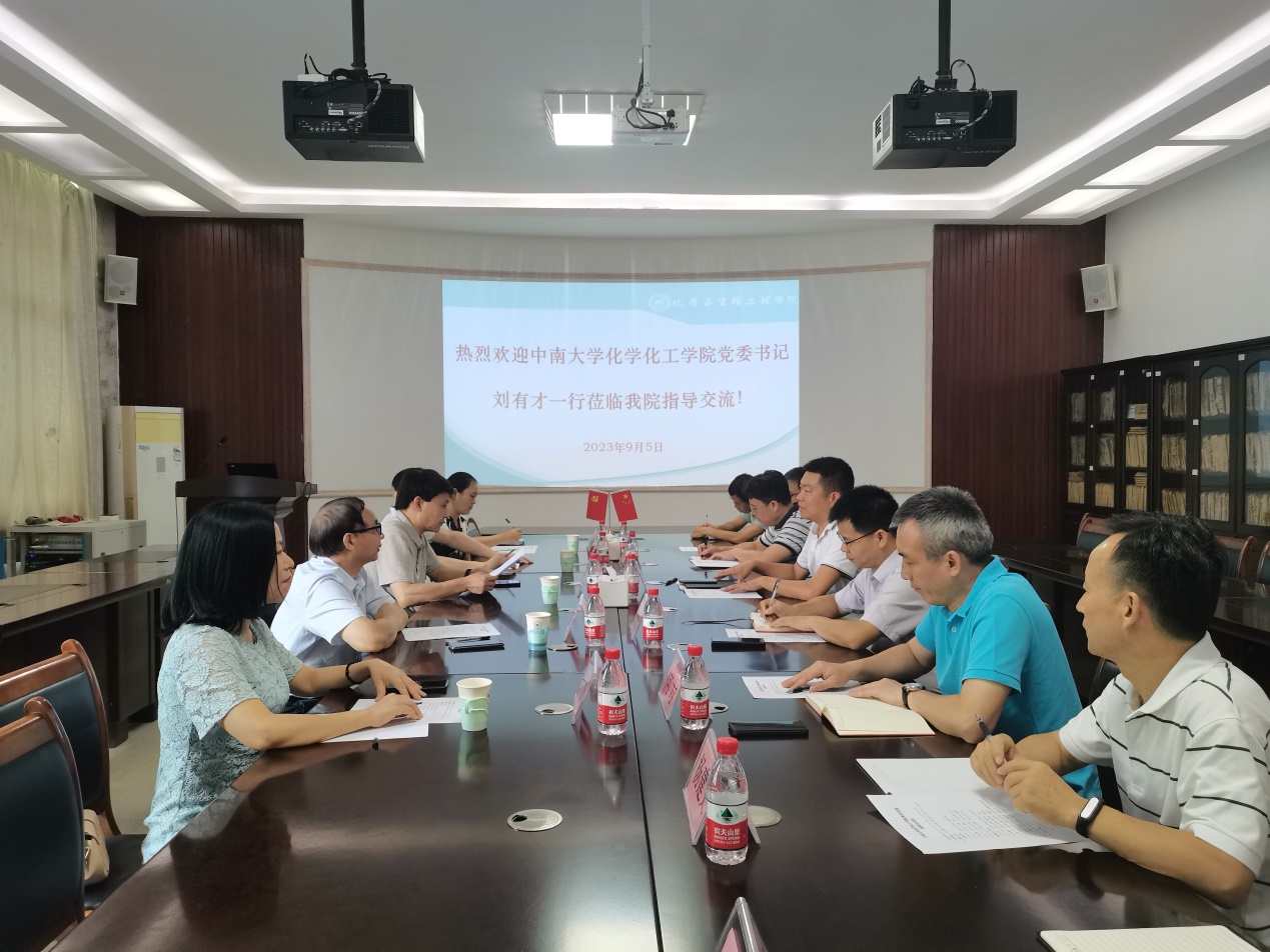 导航痕迹 当前位置: 首页 >> 新闻资讯 >> 学院新闻 >> 正文 中南大学化学化工学院党委书记刘有才一行来访我院 作者:刘耀明 发布日期:2023-09-06 浏览次数: 为贯彻落实中南大学对口支援我校的有关决策部署,9月5日上午,中南大学化学化工学院党委书记刘有才、院长刘又年率队来访我院。我院党委书记彭代江、院长匡小军在雁山校区教12楼12217会议室热情接待了来访客人,相关科室人员参加交流座谈会。 座谈会上,彭代江书记对刘有才书记一行的来访表示热烈欢迎,对中南大学化学化工学院长期以来对我院的支持和帮助表示诚挚感谢。匡小军院长介绍了学院的办学历史、办学特色、学科和专业结构、办学规模、办学成就、以及党建和思想政治工作等方面的情况。 刘有才书记在讲话中对我院的热情接待表示感谢。刘又年院长对中南大学化学化工学院在教学、科研、以及人才队伍建设方面的基本情况进行了介绍,并希望双方加强在人才队伍建设、教学、科研、论文、博士培养等全方位合作,深化沟通交流,促进互利共赢,推动双方合作向更深层次、更高水平迈进。 座谈会现场 合影 上一条:韦学敏书记一行到我院检查指导开学工作 下一条:长沙学院生物与化学工程学院院长褚武英一行来访我院