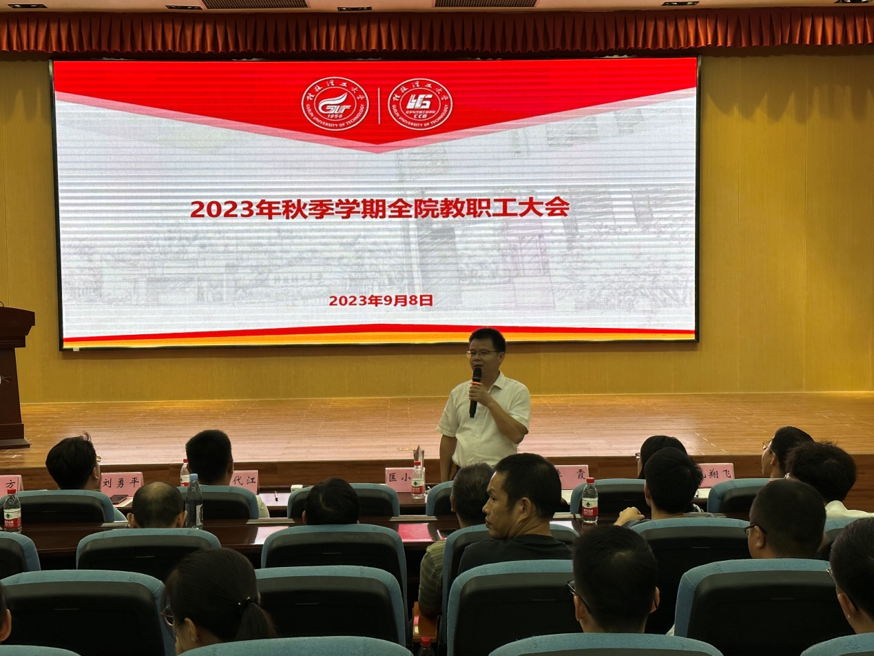 导航痕迹 当前位置: 首页 >> 新闻资讯 >> 学院新闻 >> 正文 我院召开2023年秋季学期全院教职工大会 作者:刘耀明 发布日期:2023-09-11 浏览次数: 2023年9月8日上午,我院在雁山校区图书馆报告厅召开2023年秋季学期全院教职工大会,学院全体教职工参加。会议由学院院长匡小军主持。 会上,学院各分管领导分别就所分管领域上半年开展的主要工作及成绩进行了总结,梳理了存在的问题,分析了问题产生的原因,提出了解决问题的思路和对策,并就下半年的工作计划进行了布置。 匡小军院长就上半年学院在科研项目申报、博士点建设、人才引进等重点工作情况进行了介绍,提出了下半年的工作要求,希望学院全体教师共同努力,实现工作目标。 彭代江书记在总结讲话中要求,在新的一学期,我们要总结经验,统一思想,凝聚力量,争取在教学、科研、学科平台建设等方面再上新台阶,尤其是在化学博士点申报工作中实现突破,推动化生学院各项事业高质量发展。 彭代江书记讲话 匡小军院长讲话 上一条:躬耕教坛 强国有我--77779193永利官网集团庆祝2023年教师节活动 下一条:韦学敏书记一行到我院检查指导开学工作