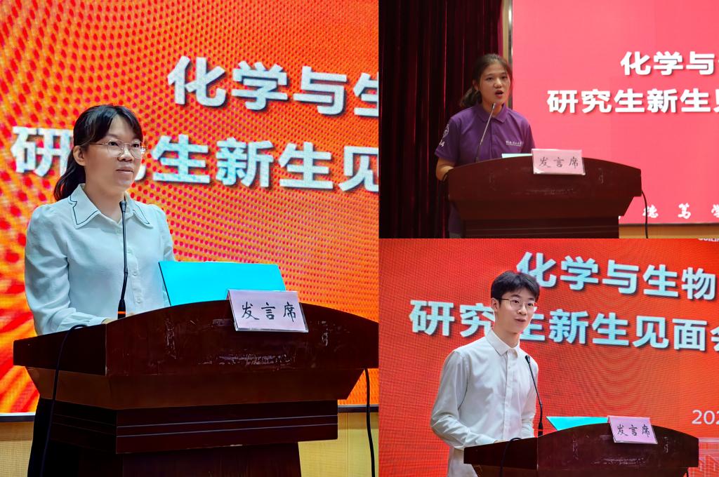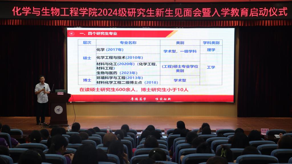 导航痕迹 当前位置: 首页 >> 新闻资讯 >> 学院新闻 >> 正文 学院召开2024级研究生新生见面会暨入学教育启动仪式 作者:黄道坤 发布日期:2024-09-10 浏览次数: 9月10日晚,学院在雁山校区图书馆报告厅隆重召开2024级研究生新生见面会暨入学教育启动仪式。学院党政领导、硕士生导师代表、研究生辅导员、研究生老生代表以及2024级全体研究生参加了本次会议。 会上,学院党委书记彭代江代表学院对212名研究生新生的到来表示热烈的欢迎和亲切的问候。他以一名师长的身份对同学们提出了三点希望:一是要心系祖国,树立远大人生理想;二是要诚信为学,坚守良好的学术道德;三是要勇于实践,坚持用创新思维服务社会。院长匡小军以“相约在化生,梦想与成功”为主题,从创新的角度畅谈化学与生物在人类社会发展中的至关重要作用。用一组组数据“数说化生”,介绍了学院发展历史、学科建设、平台建设情况;向同学们讲述了110余位教师接续奋斗的历程,为同学们传递“灯塔”的力量;聚焦科研团队、实验设备、学术活动等内容,介绍了学院科研力量;通过列举大量优秀在校生和校友的先进事迹,寄语同学们愿破茧成蝶,圆梦化生,争做新时代好青年。副院长孔翔飞从研究生专业、导师互选、研究生培养、课程学习、论文撰写等方面,向同学们详细介绍了学院硕士研究生培养工作情况。 学院导师代表杨小燕结合自己的求学经历,从保持学习热情、拓宽学术视野、提升创新能力和培养科学素养等方面进行了发言,勉励同学们尊重科学、尊重真理,为科学发展和社会进步贡献自己的一份力量。新生代表王璐表示将立德修身、明确目标、提升素养,做一个诚实守信、兢兢业业的学者。老生代表潘岩发言,勉励学弟学妹们要做好学涯规划、及时转变身份、注意沟通交流,顺利完成吃苦耐劳坚持到底的学术修行。 最后,研究生辅导员介绍了新生入学教育方案,并进行了新生入学安全专题教育。 学院党委书记彭代江致辞 学院院长匡小军介绍学院情况 学院副院长孔翔飞介绍研究生培养要求 导师代表和学生代表发言 学院为新生赠送入学礼 (一审:黄道坤;二审:宋海民;三审:李少华) 上一条:我院召开2024年秋季学期全院教职工大会 下一条:学院举办2024级本科新生见面会暨入学教育启动仪式