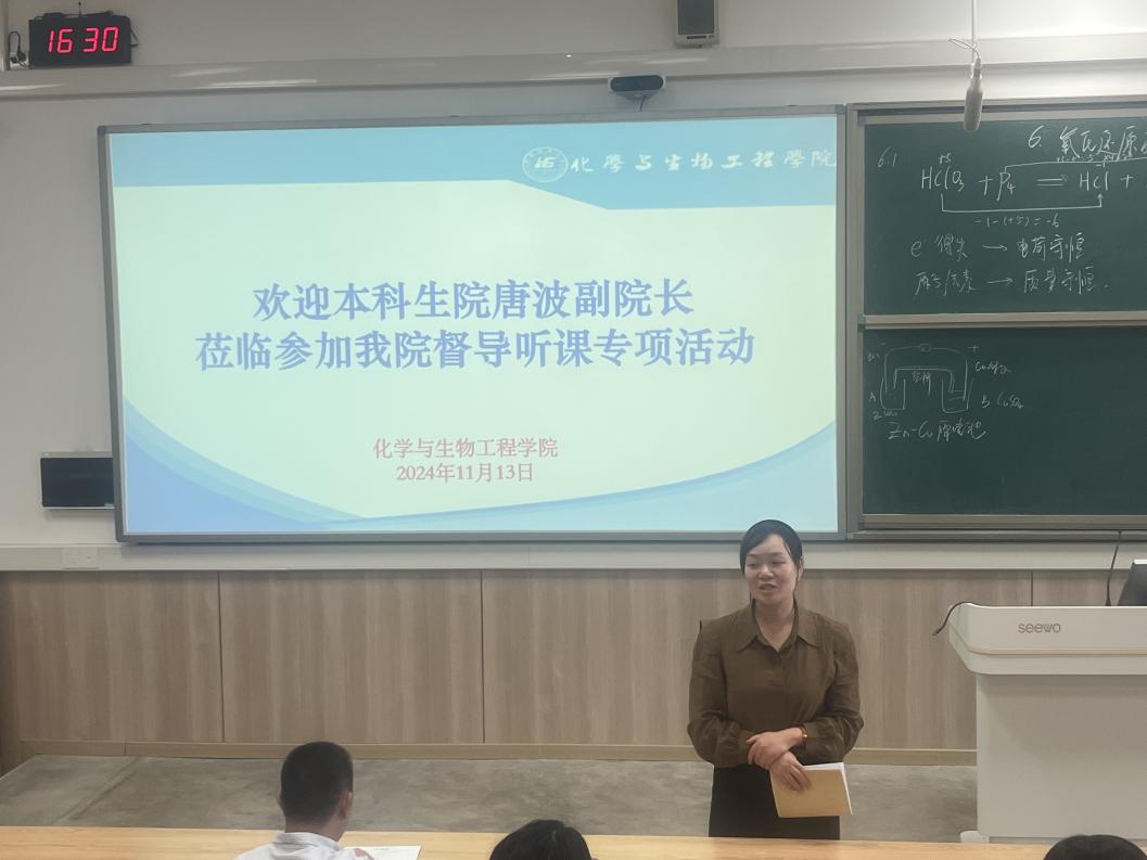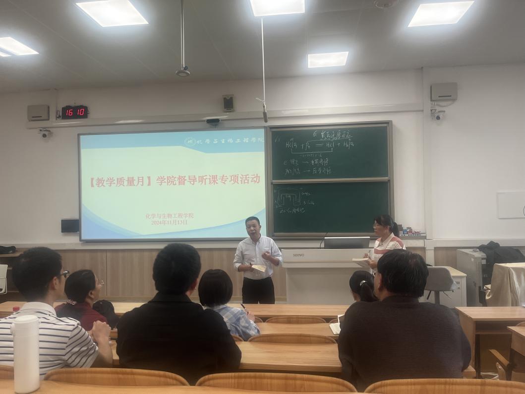 导航痕迹 当前位置: 首页 >> 新闻资讯 >> 学院新闻 >> 正文 【教学质量月】化生学院开展课堂教学督导听课专项活动 作者:李海云 发布日期:2024-11-14 浏览次数: 为进一步提高我院教师专业素养和教学能力,夯实教师驾驭课堂的教学基本功,整体提高教师的教育教学水平,根据学校“教学质量月”工作安排,2024年11月13日下午,化生学院教师教学发展分中心组织了随堂督导听课专项活动,活动在雁山校区7520教室进行,学院督导及新进教师参加了本次活动。 本次听课对象为化工教研室杨小燕老师的《无机化学》“氧化还原反应”章节内容。随堂听课结束后的交流环节,教师们踊跃发言,从教学准备、教学内容、教学设计、课程思政以及各种教学细节等方面对本次课堂教学进行了深入探讨,对授课情况进行了认真的分析和点评,充分肯定了优点,也指出了存在的不足,并提出了改进的建议。 学校本科生院唐波副院长应邀出席本次活动。在活动总结环节,唐波副院长对我院本次随堂督导听课专项活动进行了点评,并针对我院实际情况在如何提高教师教育教学水平和教学质量方面提出了宝贵建议。 本次随堂督导听课专项活动,促进了我院教师特别是新进教师的教学能力和教学水平的提高,规范教学过程,取得了较好的效果。 课堂教学 交流探讨 本科生院唐波副院长进行点评 一审:李海云 二审:马文硕 三审:李霞 上一条:【教学质量月】我院教师教学发展分中心举办“人工智能环境下的教育教学新模式和技术路径” 教学培训会 下一条:我院成功举办2024年食品安全与你同行系列比赛之第四届培养基艺术作品创意大赛