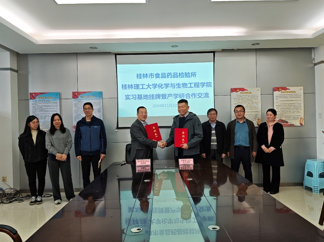 为推进产学研深度融合,进一步提高我院应用化学专业人才培养质量,解决学生实习及就业问题,实现学校与地方资源共享。2024年11月22日,我院党委书记彭代江一行三人到桂林市食品药品检验所开展合作洽谈并举行教学实践基地签约及挂牌仪式。桂林市食品药品检验所所长陆桂峰、副所长张志军、副所长陈莹、副所长肖聪及相关业务科室主任一起参加签约及挂牌仪式。 在座谈会上,彭代江书记介绍了我院的发展近况、专业特色、基层党组织建设和发展规划等,着重介绍了学校设立教学实践基地的目的和学院在这方面工作的成效。陆桂峰所长详细介绍了桂林市食品药品检验所组织架构、组织建设及部门职责,尤其深切希望所里年轻干部加强与学校之间的合作与交流。座谈会上,双方就教学实习基地建设、科研项目合作、兼职导师及兼职授课教师等相关内容进行了深入交流并达成了广泛共识。座谈会后,双方签订了教学实习基地协议,并举行了挂牌仪式。 此次教学实习基地的建立,对双方开展产、学、研全面合作,实现学校与单位优势互补与资源共享、提高人才培养质量等方面有重要意义。 图一 签约仪式 图二 挂牌仪式现场 (一审:张连明 二审:马文硕 三审:彭代江)