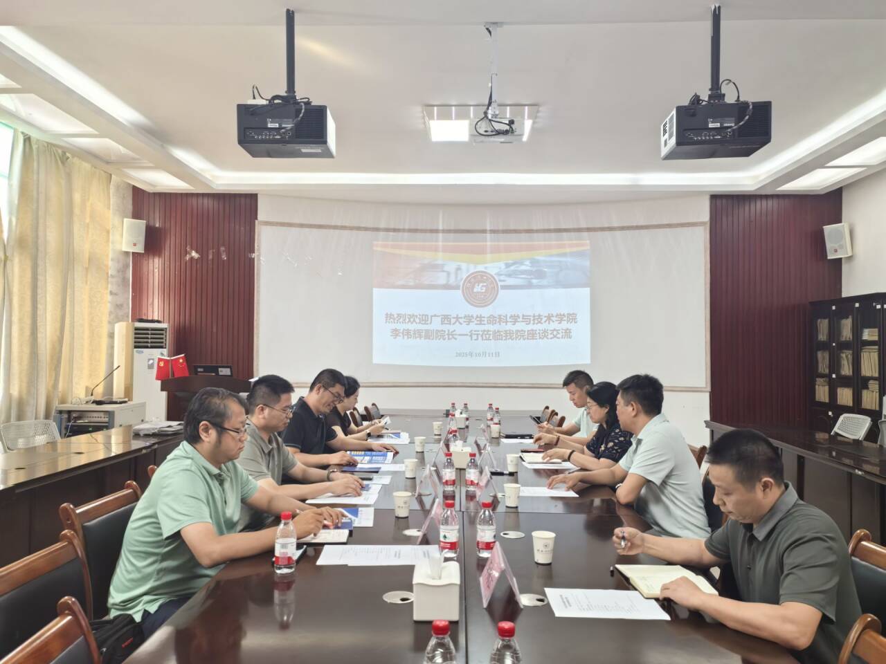 导航痕迹 当前位置: 首页 >> 新闻资讯 >> 学院新闻 >> 正文 广西大学生命科学与技术学院李伟辉副院长一行来访我院座谈交流 作者:马文硕 发布日期:2025-10-13 浏览次数: 10月11日上午,广西大学生命科学与技术学院李伟辉副院长等一行四人莅临我院,就学科发展、人才培养、科研平台建设等方面开展深入交流。我院党委书记彭代江、副院长李霞、学工组长黄道坤、生物工程教研室李海云等参加了此次座谈。 座谈会上,彭代江书记首先代表学院对李伟辉副院长一行的到来表示热烈欢迎,他表示,此次交流是双方增进了解、相互借鉴的宝贵机会,期待通过坦诚深入的探讨,为双方未来的发展注入新动能。李霞副院长简要介绍了我院的发展历史、学科建设、人才培养、师资队伍、科研平台建设以及科研团队等方面的情况。 随后,双方围绕双方重点交流了如何顺应科技前沿与国家战略需求,进一步优化调整学科方向,强化交叉融合,培育新的学科增长点。在人才培养方面,与会人员深入探讨了一流专业与一流课程建设、本科生科研能力训练、研究生培养质量保障体系、产教融合协同育人机制等具体问题。在科研平台建设方面,双方分享了各自在国家级、省部级重点实验室、工程中心等科研平台建设与管理方面的经验,并就如何整合优势资源,联合申报重大科研项目,推进产学研深度合作,促进科技成果转化,以及构建开放共享的大型仪器设备平台等议题进行了可行性探讨。 座谈会气氛活跃,双方畅所欲言,不仅分享了成功经验,也坦诚分析了面临的共性问题与挑战。一致认为,两院发展目标相通,合作空间广阔、潜力巨大。此次座谈交流,不仅加深了兄弟学院之间的情谊,更为双方未来的深度合作奠定了坚实基础,标志着两院携手共进、共谋发展的新起点。 座谈会现场 (一审:马文硕 二审:黄道坤 三审:李霞) 上一条:广西大学生命科学与技术学院到我院开展研究生招生专题讲座 下一条:学院召开人才工作专题会议