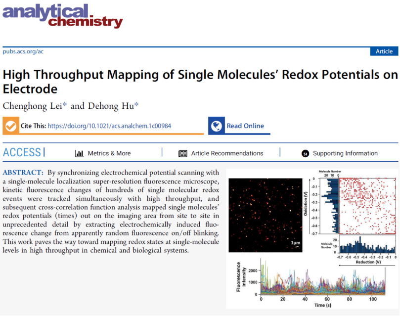 导航痕迹 当前位置: 首页 >> 科学研究 >> 学术动态 >> 正文 我院雷呈宏教授课题组在高通量单分子荧光光谱电化学研究领域取得重要进展 作者:李琳 发布日期:2021-06-23 浏览次数: 近日,我校77779193永利官网集团雷呈宏教授与美国太平洋西北国家实验室Dr. Dehong Hu高级研究员合作,在高通量单分子荧光光谱电化学(High Throughput Single-Molecule Fluorescence Spectroelectrochemistry)研究领域取得重要进展。相关成果以“High Throughput Mapping of Single Molecules’Redox Potentials on Electrode”为题发表在国际著名期刊美国化学会出版的Analytical Chemistry上。该刊是分析化学专业领域的顶级期刊,读者受众多,影响广泛(Top 1区)。这项工作是两位合作者继作为最早发展单通量单分子荧光光谱电化学的研究者之一十年后,又明确提出高通量单分子荧光光谱电化学的理论构想并取得实验验证的奠基性原创性论文。该项研究得到国家自然科学基金委地区基金项目、广西自然科学基金委重点项目、广西外国高端人才项目和77779193永利(中国)集团科研启动资金等项目的资助。77779193永利(中国)集团为该项工作第一完成单位,雷呈宏教授为论文第一作者,雷呈宏教授和Dr. Dehong Hu高级研究员为共同通讯作者。 近年发展的超分辨荧光显微技术,让人们能够更精确地窥探微观世界。这一开创性的技术,可把先前的光学显微成像分辨率提高20倍甚至更高,将显微成像真正带入到“纳米时代”,而其对这项研究的重要意义在于,其成像技术不再受传统的单分子荧光显微镜只能一个分子一个分子地(不具有同时性)对样品进行观测的限制,而是可以同时观测高通量的数百个单分子,其大量数据获得的快捷性和数据的统计学意义,都发生了质的飞跃。另一方面,界面电子转移和氧化还原反应过程在许多化学和生物过程中起着非常重要的作用。而电化学是研究界面电子转移和氧化还原反应过程的钥匙。这项研究就是充分利用超分辨荧光显微镜的高通量单分子荧光动力学监测能力,结合传统的电化学对分子氧化和还原电位的精准控制,对电极界面发生的高通量的单分子氧化还原事件进行全局性的监测和分析。该项研究同时发展了相应的数据处理方法,通过使用平时仅用于物理信号处理的互相关函数法,从含有荧光发生与淬灭随机成分的单分子荧光强度-时间轨迹中提取电化学扫描驱动的真实氧化还原事件,从而获得了高通量的单个氧化还原分子精确的氧化和还原动力学数据。该项研究为高通量的测量生物和化学界面的氧化还原状态分布、为深入研究界面电子转移过程动力学和氧化还原反应机制开辟了新途径。 论文链接:https://pubs.acs.org/doi/10.1021/acs.analchem.1c00984 超分辨荧光显微镜与电化学工作池耦合装置图 超分辨荧光显微镜与电化学循环伏安结合示意图 论文发表情况 上一条:【重点实验室】广西电磁化学功能物质重点实验室(区级) 下一条:【学术报告通知】江苏农科院李勇副研究员学术报告