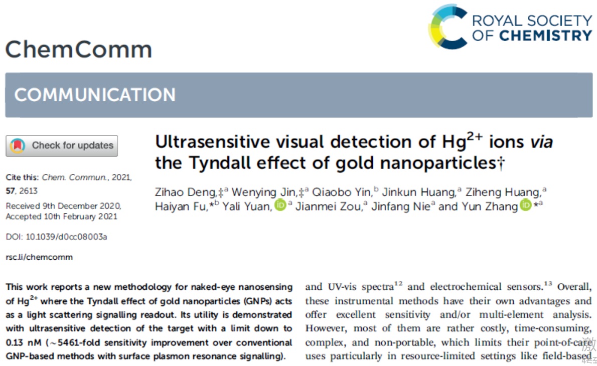 导航痕迹 当前位置: 首页 >> 科学研究 >> 学术动态 >> 正文 我院张云教授课题组在POCT研究领域取得重要进展 作者:邓子豪 发布日期:2021-05-18 浏览次数: 即时检测(POCT,point-of-care testing)泛指一类利用便携式设备及配套试剂实现现场快速检测分析的新方法。该方法具有成本经济、操作简单、检测快速等突出优点,尤其适用于偏远地区、突发事件现场、家庭自检等资源有限环境下进行疾病诊断、环境污染监测和食品安全分析。然而,真正成功实现商品化且进入千家万户的仅有血糖仪等屈指可数的POCT产品,远不能满足人们日益增长的健康提升需要。事实上,发展新型POCT方法已成为21世纪人类在分析化学领域面临的最重大挑战之一。 光散射是自然界中一种常见的光学现象,如晚霞、蓝天等。丁达尔效应(TE,Tyndall effect)则是一种发生在胶体溶液中的光散射现象——当一束光线透过此类溶液时,从垂直入射光方向可以观察到一条因胶体颗粒对光线散射后形成的光亮“通路”。尽管国内外已有少量报道利用TE开展某些溶液体系的纳米水平团聚行为或胶体催化剂形成过程的定性研究,但其高效的比色信号转换特性及相关分析应用潜力还远远未被充分认识和开发。 受此类自然现象的产生主要依赖胶体颗粒浓度和尺寸的启发,我院张云教授和中南民族大学付海燕教授合作,以纳米金为模型胶体体系,首次发展了一种基于TE的高毒害性Hg2+离子高灵敏POCT可视化检测新方法。纳米金经自组装修饰Tween-20后可在高浓度盐溶液中稳定单分散。当样品中存在靶标离子时,该稳定剂分子将因胶体探针表面形成Hg-Au合金而脱落;后者随即发生团聚并生成更大尺寸的复合物,最终导致反应溶液的TE明显增强。研究结果表明,新方法仅需使用一只激光笔(作为手持式光源)和一台智能手机(用于TE成像)即可测定浓度低至0.13 nM的Hg2+离子,比基于表面等离子体共振原理且依赖大型光学仪器的传统比色分析策略的检测灵敏度显著提高了5400倍以上。 相关成果以“Ultrasensitive visual detection of Hg2+ions via the Tyndall effect of gold nanoparticles”为题发表在化学领域国际知名期刊Chemical Communication(自然指数收录的82种全球自然科学类顶级期刊之一;影响因子5.996),并被选为当期的OutsideBack Cover(外封底;以中国古代传说“牛郎织女鹊桥相会”为创意)。该项研究得到国家自然科学基金面上项目、广西杰出青年基金、中央引导地方科技发展资金、广西重点研发计划等项目资助。我院硕士研究生邓子豪和讲师金文英为论文共同第一作者,77779193永利(中国)集团为第一通讯单位。 论文链接:https://pubs.rsc.org/en/content/articlehtml/2021/cc/d0cc08003a。 论文发表情况 基于TE和纳米金(GNP)的Hg2+离子POCT分析原理示意图 Outside Back Cover(外封底) 上一条:【学术报告通知】广西电磁化学功能物质重点实验室2021年学术交流会系列学术报告 下一条:【学术报告】北京化工大学赵宇飞教授到我院讲学