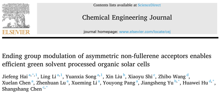近日,我院海杰峰副教授联合南京理工大学俞江升副研究员、东华大学胡华伟研究员和南京大学陈尚尚教授在绿色高效有机太阳能电池研究方面取得最新成果,在知名期刊Chemical Engineering Journal(SCI一区TOP期刊,IF=16.744)上发表题为“Ending group modulation of asymmetric non-fullerene acceptors enables efficient green solvent processed organic solar cells”的研究论文。该项研究工作得到广西自然科学基金(2022JJA120094)、广西电磁化学功能物质重点实验室开放基金(EMFM2022101)和广西高校中青年教师科研基础能力提升项目(2022KY0256)等多个项目的资助。