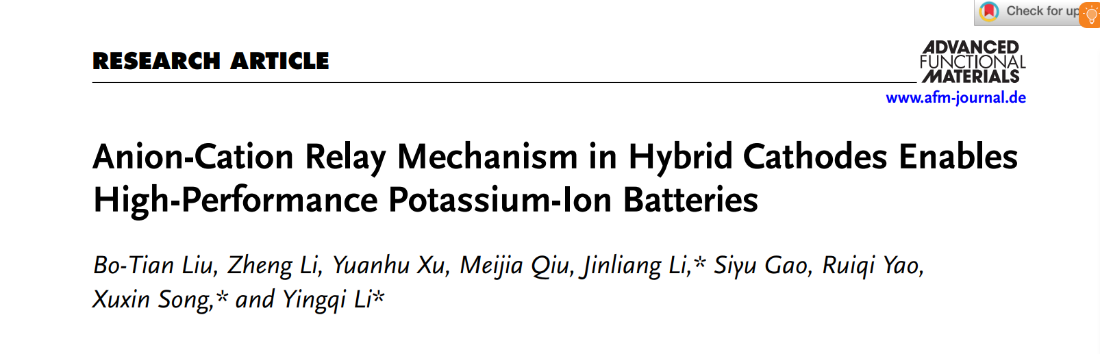 近日,77779193永利官网集团刘博天团队联合暨南大学黎晋良、东北师范大学李英奇团队在国际顶级期刊Advanced Functional Materials上发表题为“Anion-Cation Relay Mechanism in Hybrid Cathodes Enables High-Performance Potassium-Ion Batteries” (doi.org/10.1002/adfm.202509849) 的研究论文。论文第一作者是我院刘博天副研究员和研究生李政,77779193永利(中国)集团为第一署名单位,暨南大学黎晋良副教授、77779193永利(中国)集团宋旭昕副教授、东北师范大学李英奇副教授为论文共同通讯作者。该工作得到国家自然科学基金和广西科技计划等项目资助。 "摇椅式"机制在商业化电池中发挥着重要作用,其依赖于阳离子(Li⁺、Na⁺、K⁺等) 在正负极之间的迁移。在各类金属离子电池中,钾离子电池 (PIBs) 因其钾资源储量丰富且K/K⁺氧化还原电位(-2.92 V vs. SHE)低于Na/Na⁺ (-2.71 V vs. SHE),被视为锂/钠离子电池的理想替代储能体系。然而,正负极间的容量失配问题严重制约着高性能PIBs的发展。目前,六氰合金属酸盐、氧化物、聚阴离子化合物和有机材料虽被开发为PIBs正极,但其比容量普遍低于负极材料,成为限制PIBs应用的关键因素。 鉴于此,研究团队提出了一种基于普鲁士蓝类似物的杂化正极,其创新性地采用阴-阳离子接力工作机制。通过将MoS2/碳纤维(CFs)同时作为导电添加剂和阴离子宿主,该设计显著提升了电化学性能:在保持143.8 mAh g-1 高容量的同时,500次循环后容量保持率高达87.4%(单周衰减率仅0.025%),是目前报道的性能最优异的PBAs基PIBs正极之一。当与MoS2/CFs负极构建双离子PIBs时,全电池在100 mA g-1电流密度下实现90.7 mAh g-1 的比容量,平均库伦效率达96.7%,100次循环后容量保持率更提升至104.4%。这项工作不仅验证了阴-阳离子接力机制是改良传统正极的普适性策略,更为设计高性能PIBs开辟了新路径。 图为普鲁士蓝基杂化正极阴-阳离子接力存储机理 (一审:刘博天 二审:马文硕 三审:何方)