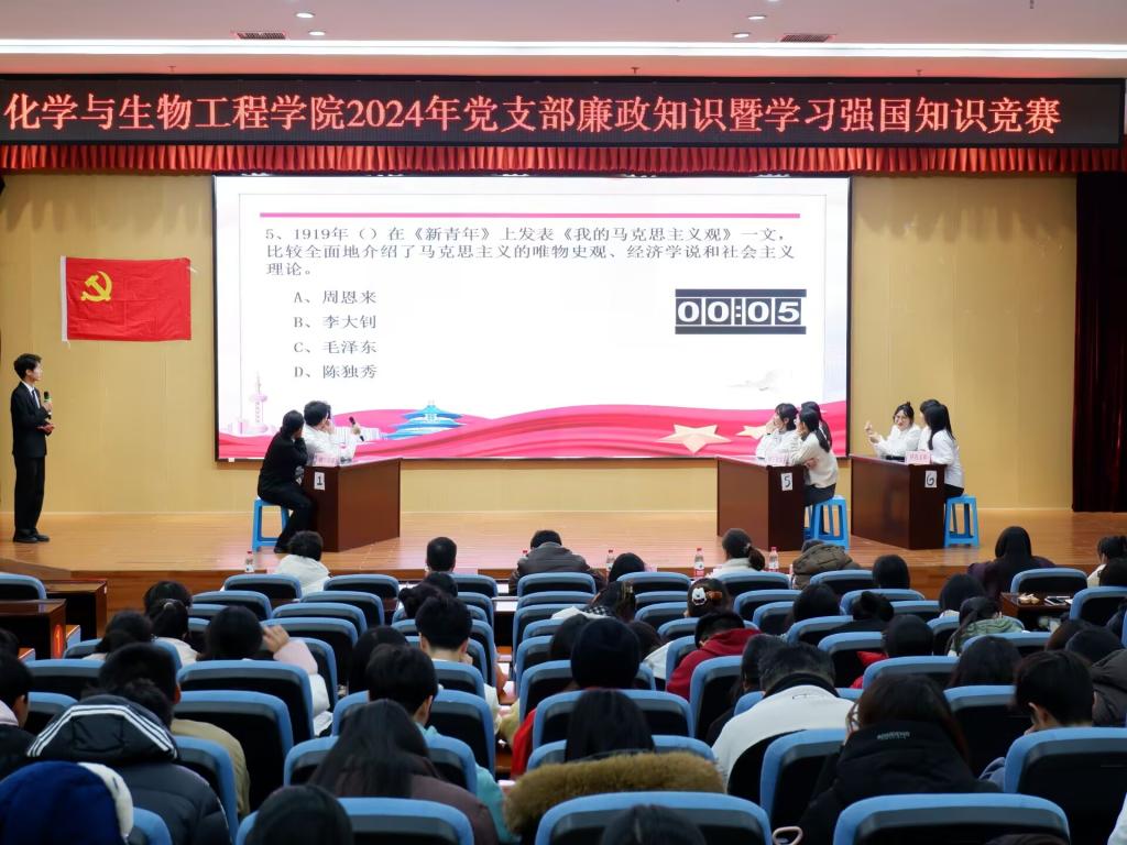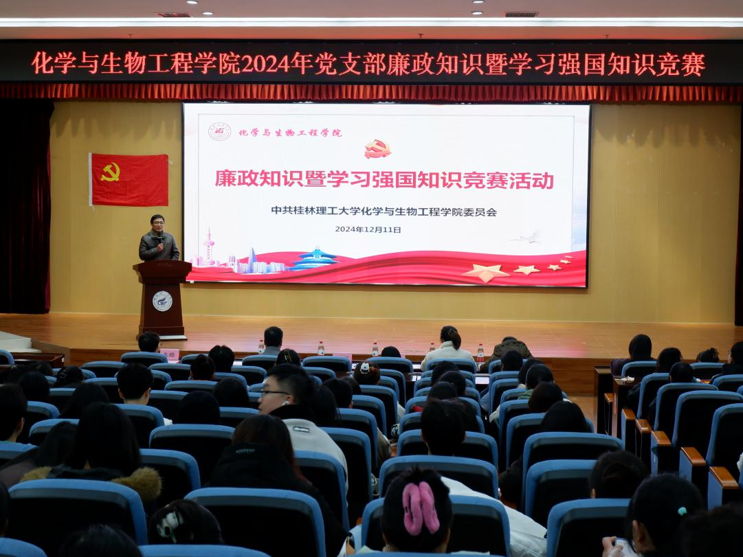 导航痕迹 当前位置: 首页 >> 永利集团 >> 党风廉政建设 >> 正文 【清廉学院】我院举办2024年党支部廉政知识暨学习强国知识竞赛 作者:黄道坤 发布日期:2024-12-11 浏览次数: 为深入贯彻落实习近平总书记关于全面从严治党的重要论述,进一步加强师生党员的党性教育和纪律意识,提升党员党性修养。12月11日晚上,学院在雁山校区图书馆报告厅开展“廉政知识暨学习强国知识竞赛”活动。学院党委副书记、纪委书记李少华老师、各党支部书记及党员师生代表180余人参加本次活动。 本次知识竞赛分为积分赛、抢答赛、总决赛三个环节,内容涵盖了党章党规党纪、党史、新中国史、改革开放史、社会主义发展史、党的二十大、二十届三中全会精神、党务知识、时事政治等内容,设置必答题、抢答题、风险题、观众互动题等趣味环节,活动现场既有紧张激烈的竞赛氛围,又有团队协作的温暖瞬间,各支部参赛选手冷静思考、沉着应答,展现出了扎实的理论知识基本功和奋发进取的精神风貌。同时,比赛现场还设置了“猜猜我是谁”“红歌转转转”“我是幸运儿”等观众互动环节,让现场每一位参与者都沉浸其中、乐在其中、学在其中。最后,学院为获奖各支部和学习强国年度前十名进行了表彰。李少华在竞赛中强调,各党支部要不断创新学习方法、拓宽学习渠道,进一步增强纪律意识和规矩意识,努力打造一支政治过硬、业务精湛、作风优良的党员队伍,为“清廉化生”建设作出应有贡献。 此次竞赛的成功举办,不仅进一步加深了全院师生党员对党规党纪的了解和掌握,还提高了理论水平和政治素养。下一步,学院将继续加强对师生党员的纪律教育,为推动学院高质量发展贡献更大的力量。 活动现场 活动现场 (一审:黄道坤;二审:宋海民;三审:李少华) 上一条:【党风廉政】学院党委开展廉政家访送清风共筑防线活动 下一条:【党风廉政】学院开展大学生党员廉洁教育专题党课