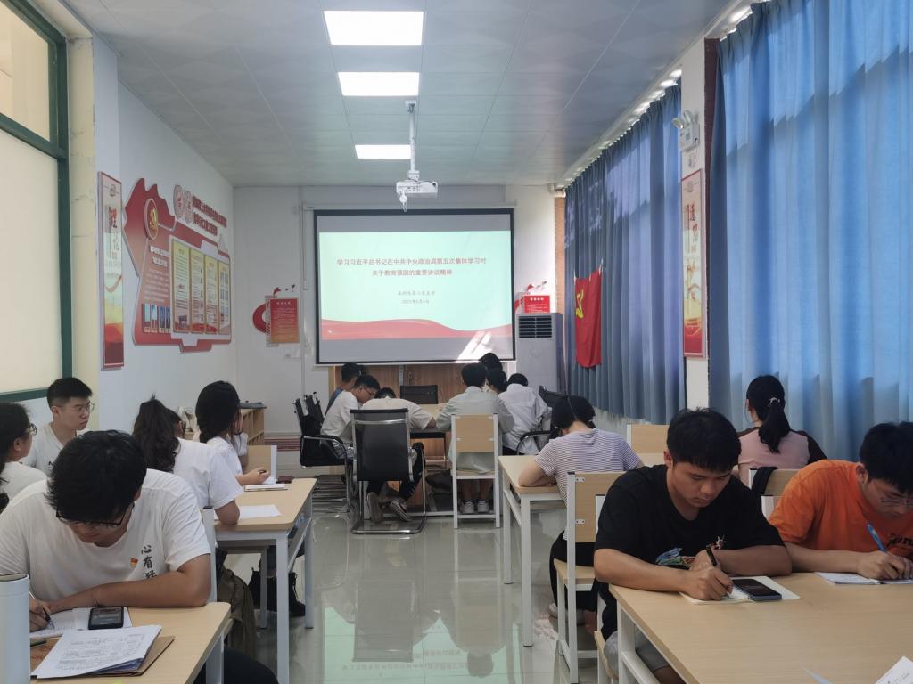 导航痕迹 当前位置: 首页 >> 永利集团 >> 新时代高校党建“双创”工作专栏 >> 正文 我院本科生第二党支部开展“学习习近平总书记在中共中央政治局第五次集体学习时关于教育强国的重要讲话精神”主题党课 作者: 发布日期:2023-06-04 浏览次数: 为深入学习贯彻 “习近平总书记在中共中央政治局第五次集体学习时关于教育强国的重要讲话精神”,充分发挥支部党员的主观能动性,以习近平总书记重要讲话为引领,脚踏实地、求真务实,以更加昂扬的斗志、饱满的热情投入到教育强国、人才强国建设工作中。6月4日下午,我院本科生第二党支部于全国样板党支部连廊开展“习近平总书记在中共中央政治局第五次集体学习时关于教育强国的重要讲话精神”主题党课学习,本次活动由支部书记张伟颀同志主持,支部党员及发展对象一同参与。 会议伊始,张伟颀同志带领大家深入学习了习近平总书记在中共中央政治局第五次集体学习时关于教育强国的重要讲话内容,同时,张伟颀同志结合自身实际讲述作为一名教师的责任和义务。随后,同志们充分发表自己的感想,尹学文同志表示,作为一名学生党员,我们更应该提高自身能力,扎实掌握专业知识,为祖国的建设添砖加瓦;胡宗璇同志表示,我们应该勇于突破自我,不断向他人学习,不断进步。 通过本次党课的学习,支部党员同志们深刻认识到教育、科技、人才的重要意义,同时也更加坚定了支部党员为祖国的建设奉献青春的信念。作为新时代青年,我们更应该扎实掌握科学文化知识,不忘初心,艰苦奋斗,并将个人奋斗融入到中华民族伟大复兴的历史进程中去,以实际行动奋进新的征程。 会议现场 上一条:我院本科生第三党支部召开“习近平总书记在中共中央政治局第五次集体学习时的关于教育强国的重要讲话精神学习”党员大会 下一条:【预备党员培训班】第二十五期预备党员培训班第二讲——坚持党性锻炼,永葆共产党员的本色